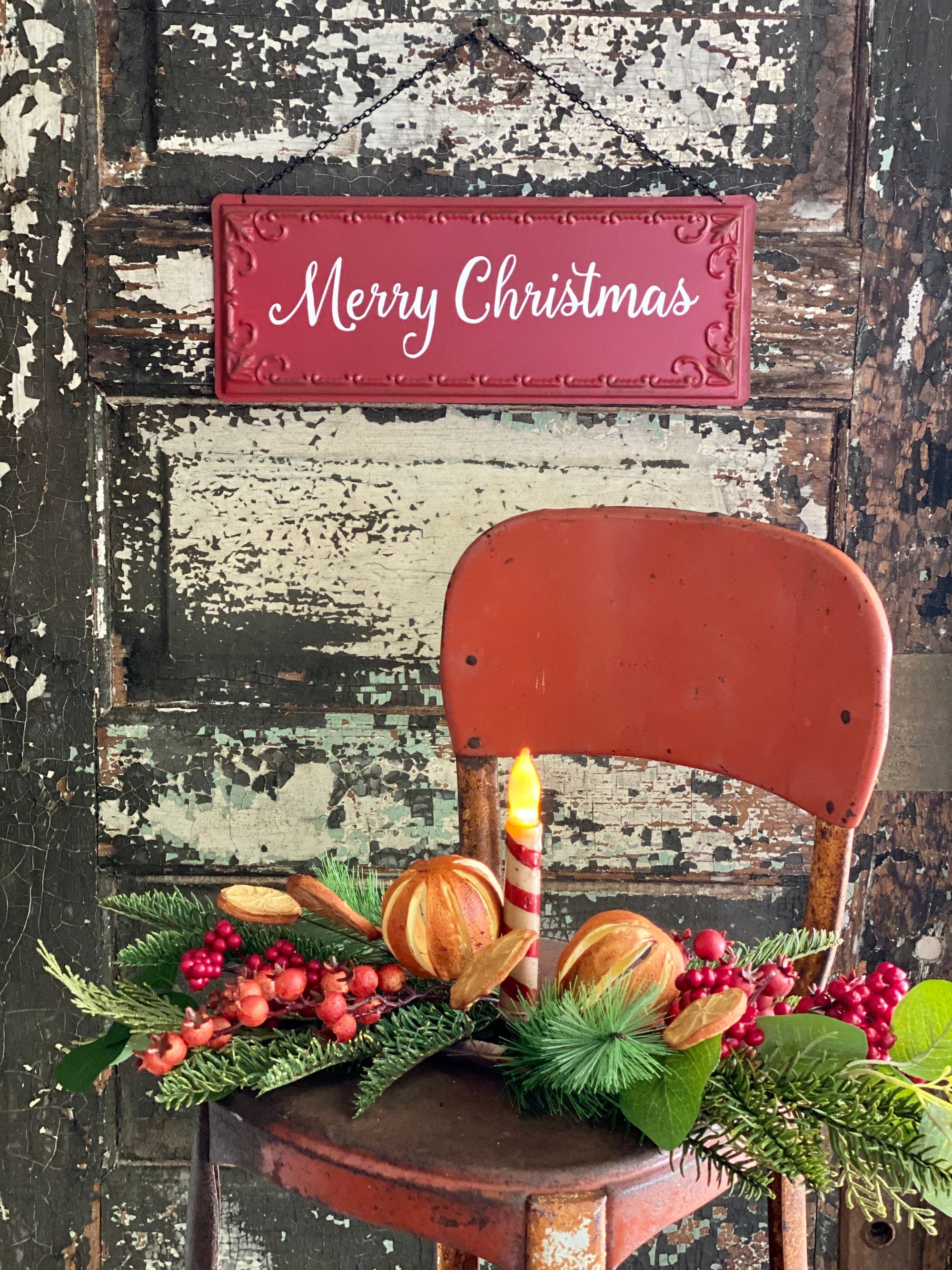The perfect addition to your holiday decor! Gorgeous true holiday red tin sign with 'Merry Christmas' script in white. Slight bit of rusty coloring around scroll border for a vintage farmhouse look. Includes a link chain for easy hanging. Perfect accent piece for any room of the home or office. Perfect gift for that hard to buy for person!