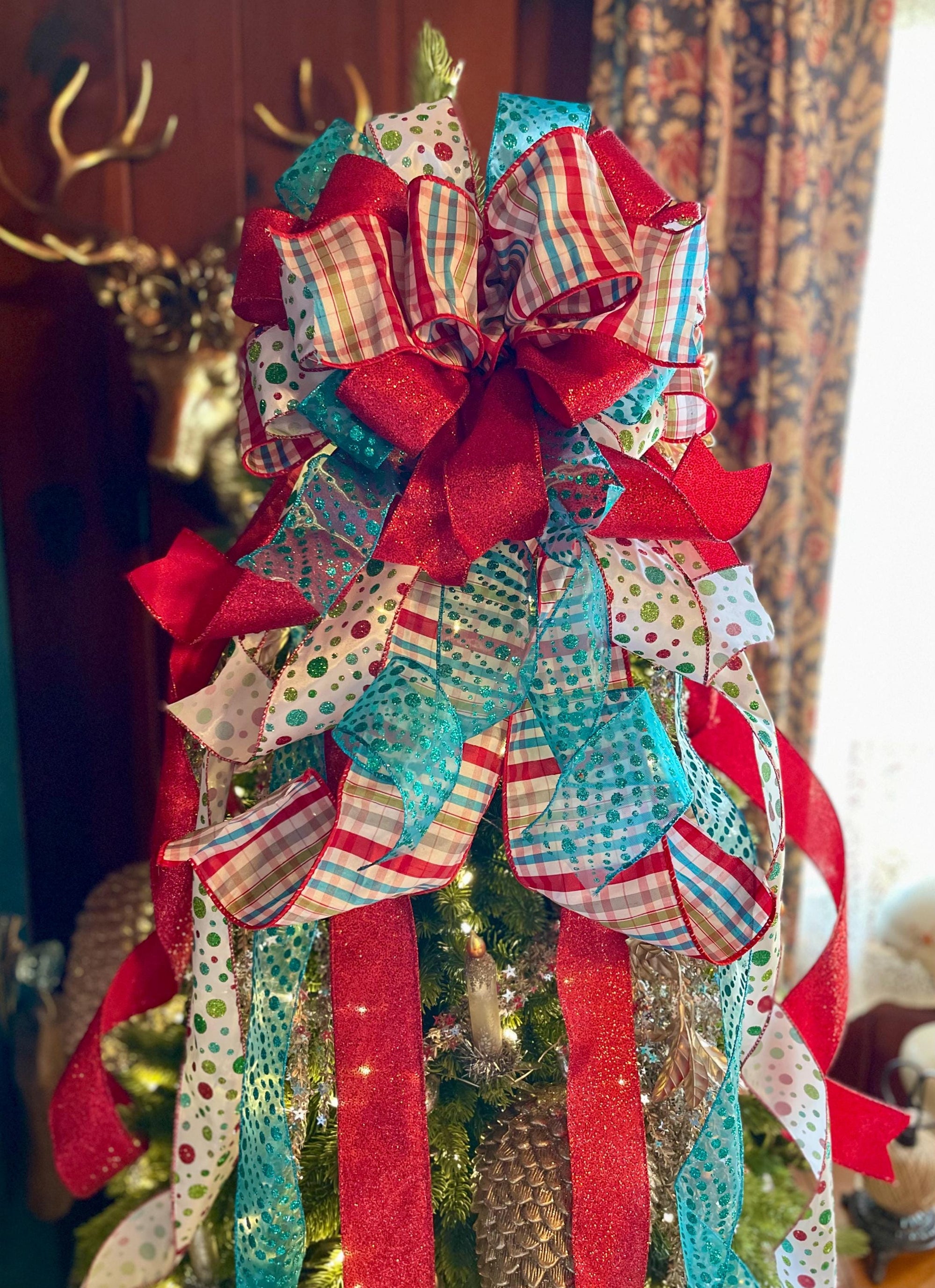 Merry and bright with all the yuletide spirit you’ll need this year! This big bow features a luxury fabric in an extra wide 4” width - a red blue and white plaid, a glittering red, a turquoise blue glitter dot & a white with colorful glitter dots. Lots of streamers provides excellent coverage for your tree.