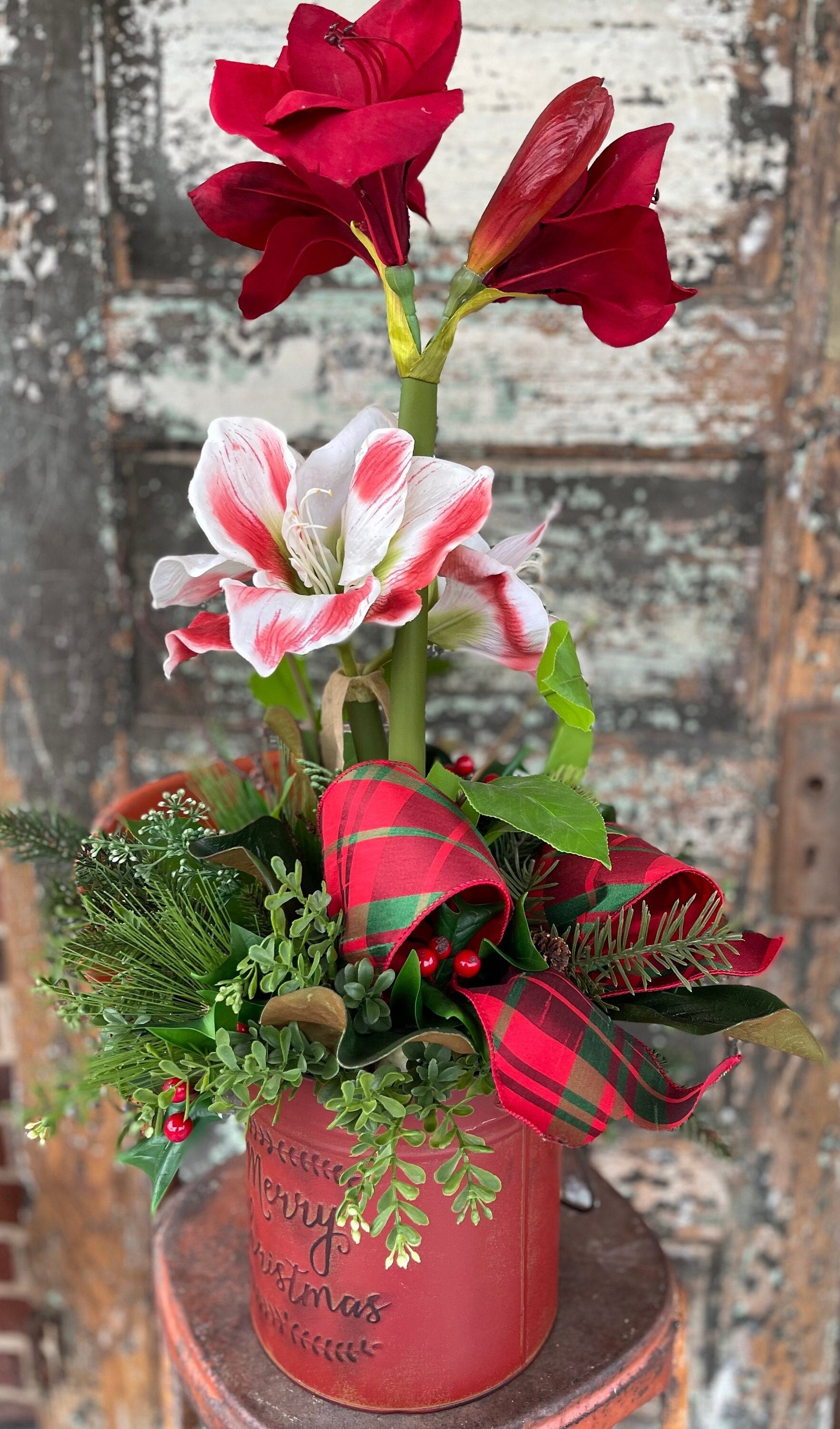 Looking for a gift for that hard to buy for person? A beautiful floral arrangement is the perfect choice ~ everyone loves flowers! Beautiful bright red and white amaryllis mixed with holly, berries, pine, boxwood, juniper, pinecones, magnolia leaves, gorgeous red & green ribbon makes this piece a welcome addition to any home during the dreary winter months. Realistic blooms styled in a fabulous deep red metal pail with wood knob handle - container has a raised ‘Merry Christmas’ script.