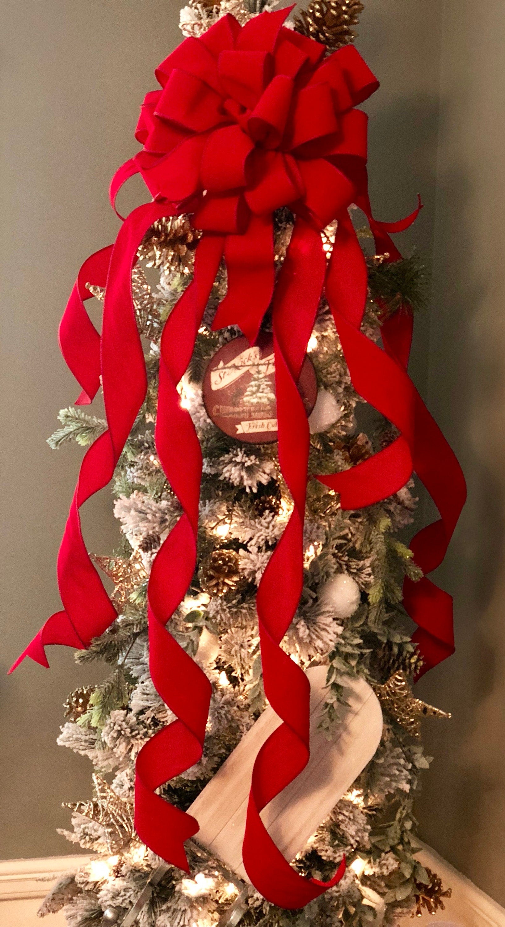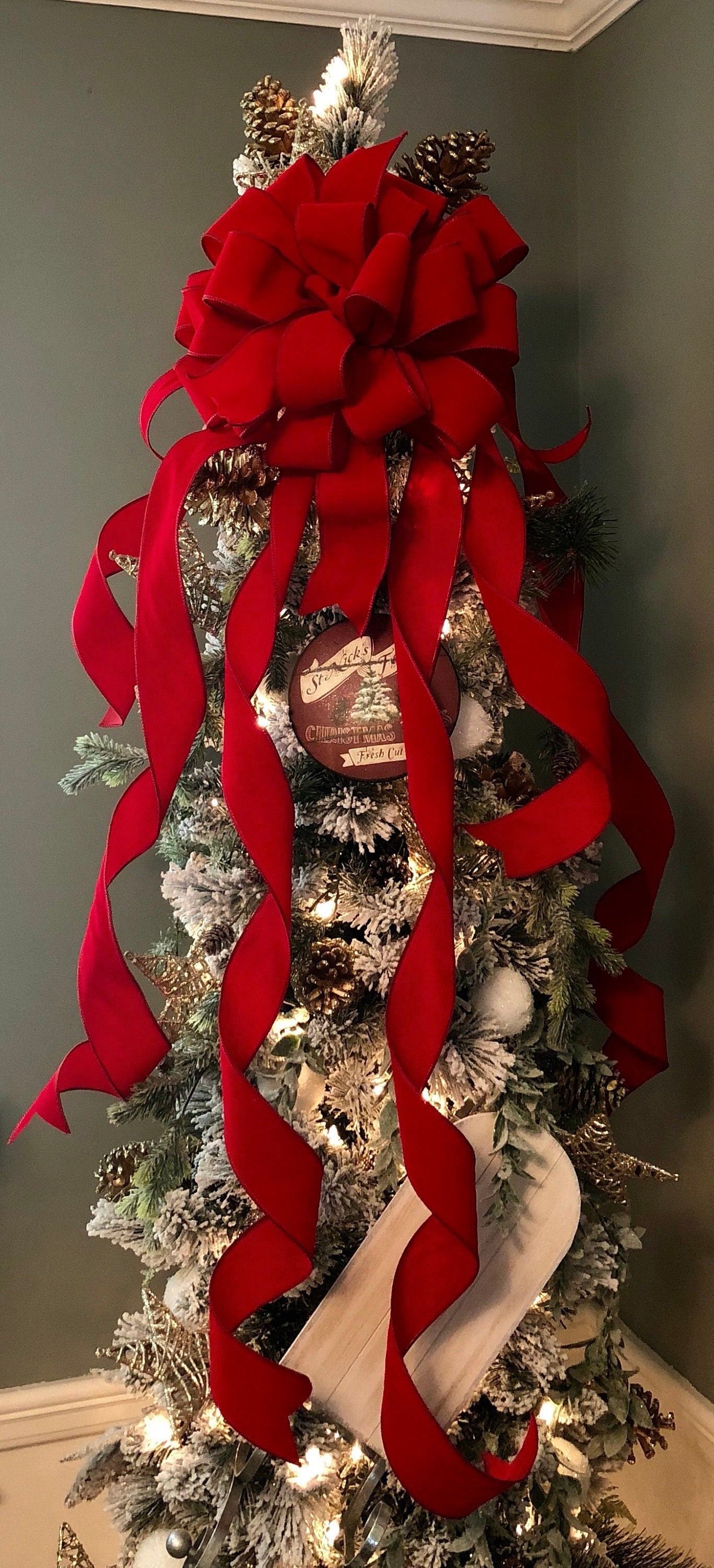 Bow Displayed on a 7 1/2ft slim tree, & 26” wreath bow may appear differently depending on the size and shape of your tree/wreath.