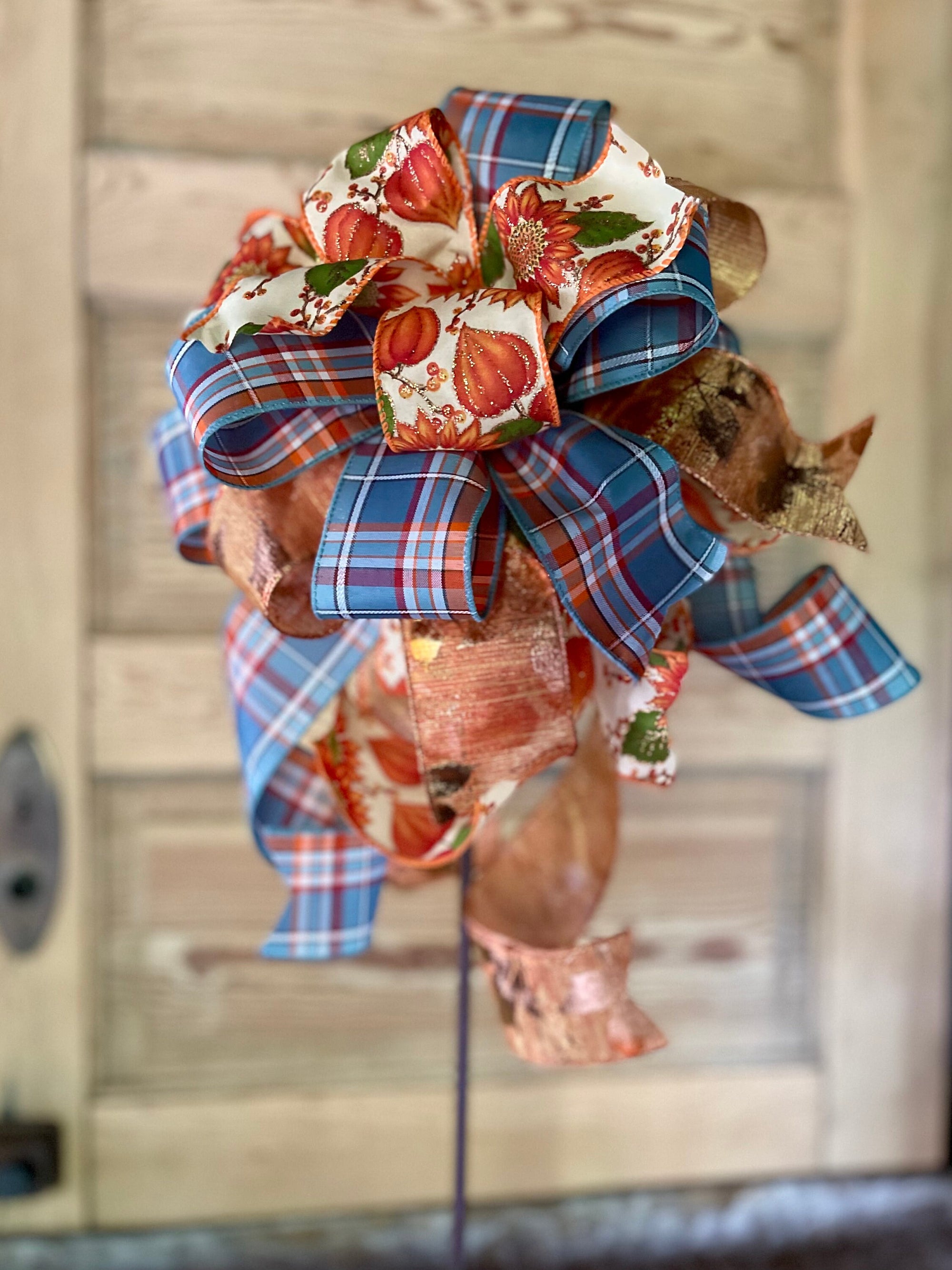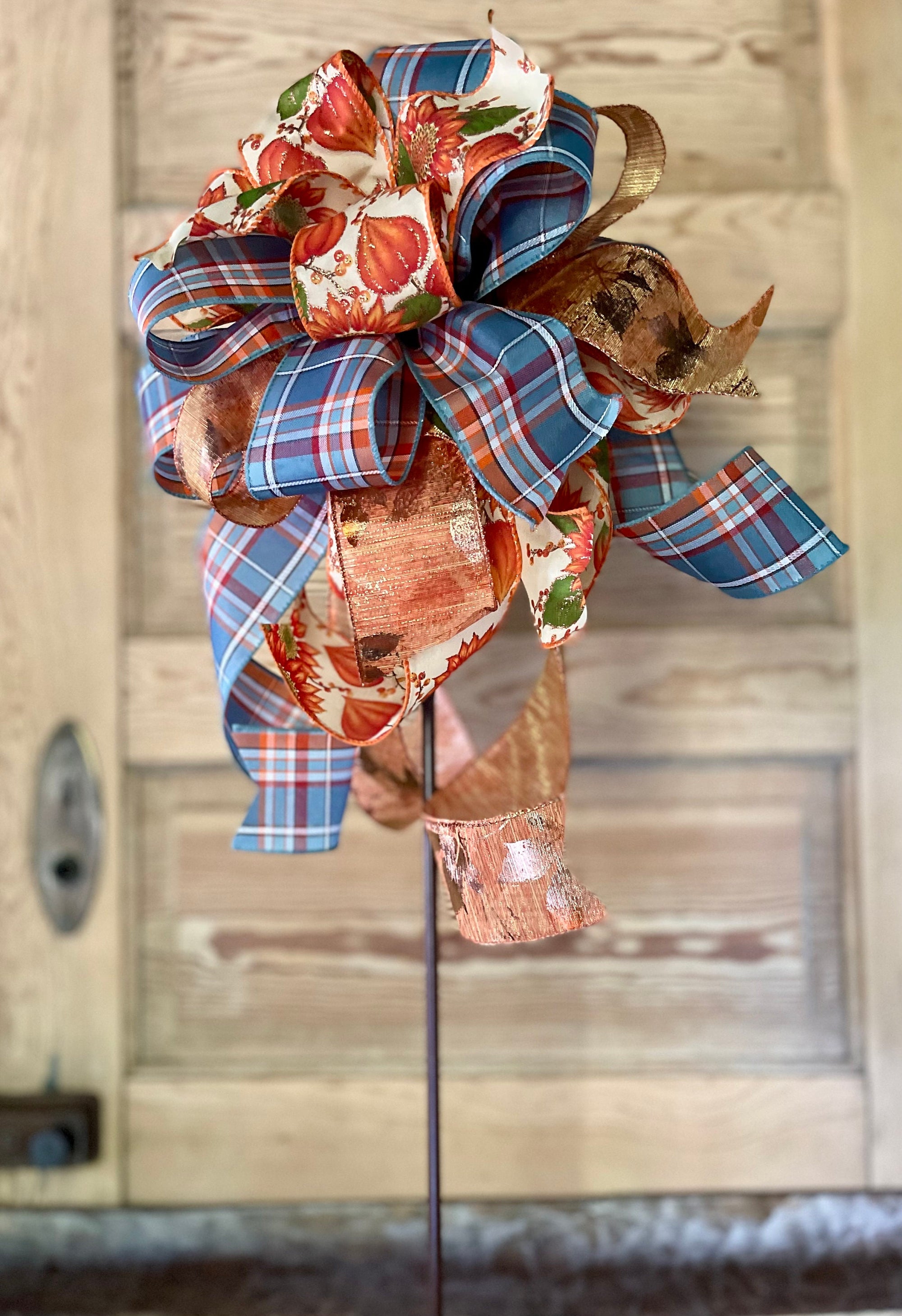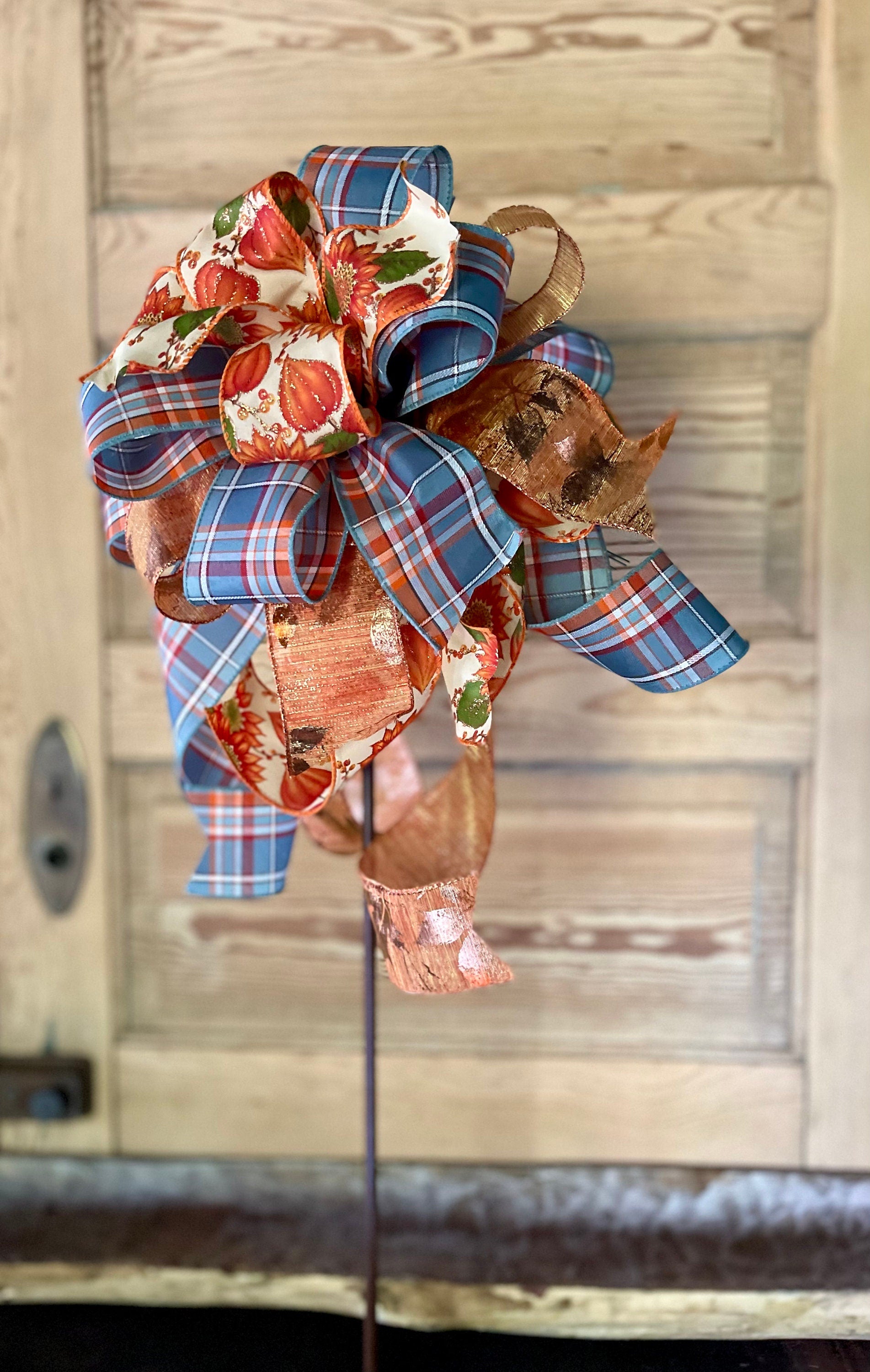 Sherry is a soft beautiful bow that really stands out! Made with 3 gorgeous fabrics in orange, copper & teal blue tones - a classic plaid print in teal blue and orange mixes perfectly with a tan and orange glitter sunflower print and a shimmering copper fall leaf fabric. All streamers are varying lengths with the longest being 17".