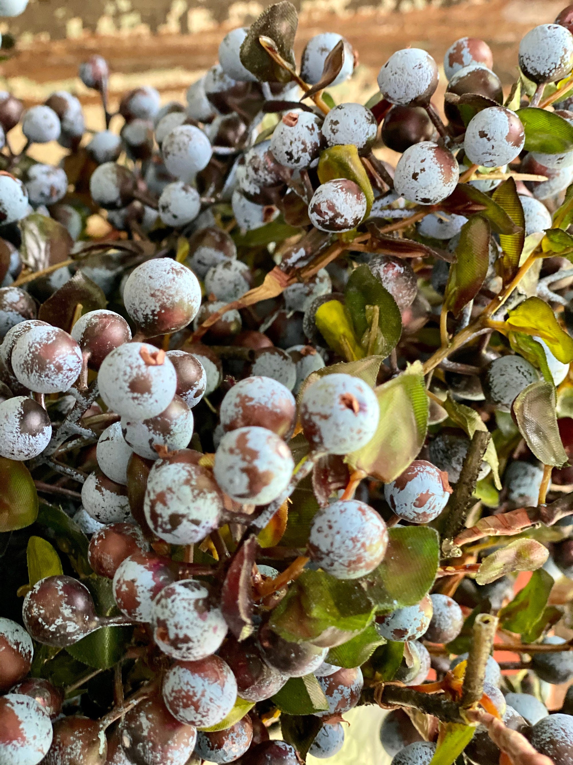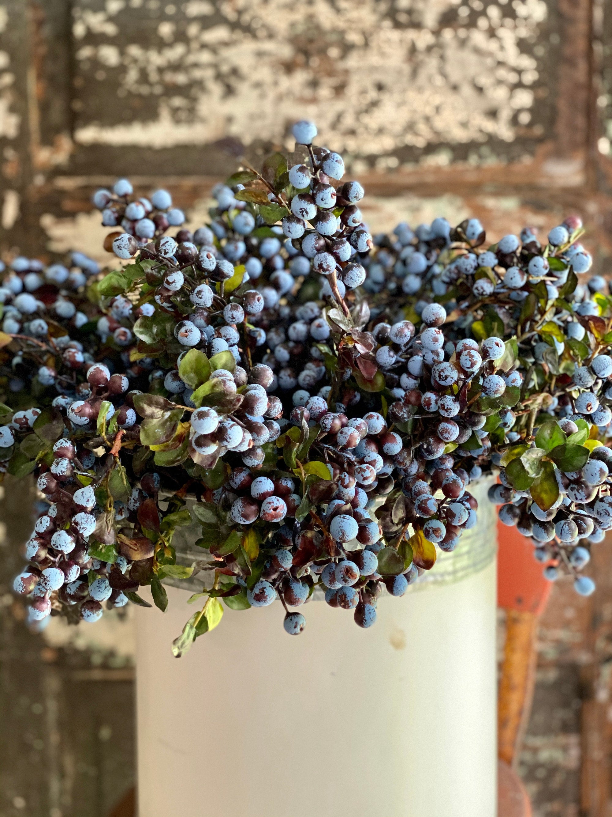 Our freshest looking blueberries that look good enough to eat! This beautifully made faux blueberry stem features three clusters of berries ripe for the picking! Made of foam, wired stems with delicate leaves that mimic the real plant. Long stem wrapped with a dark textured finish that lends to a realistic feel.