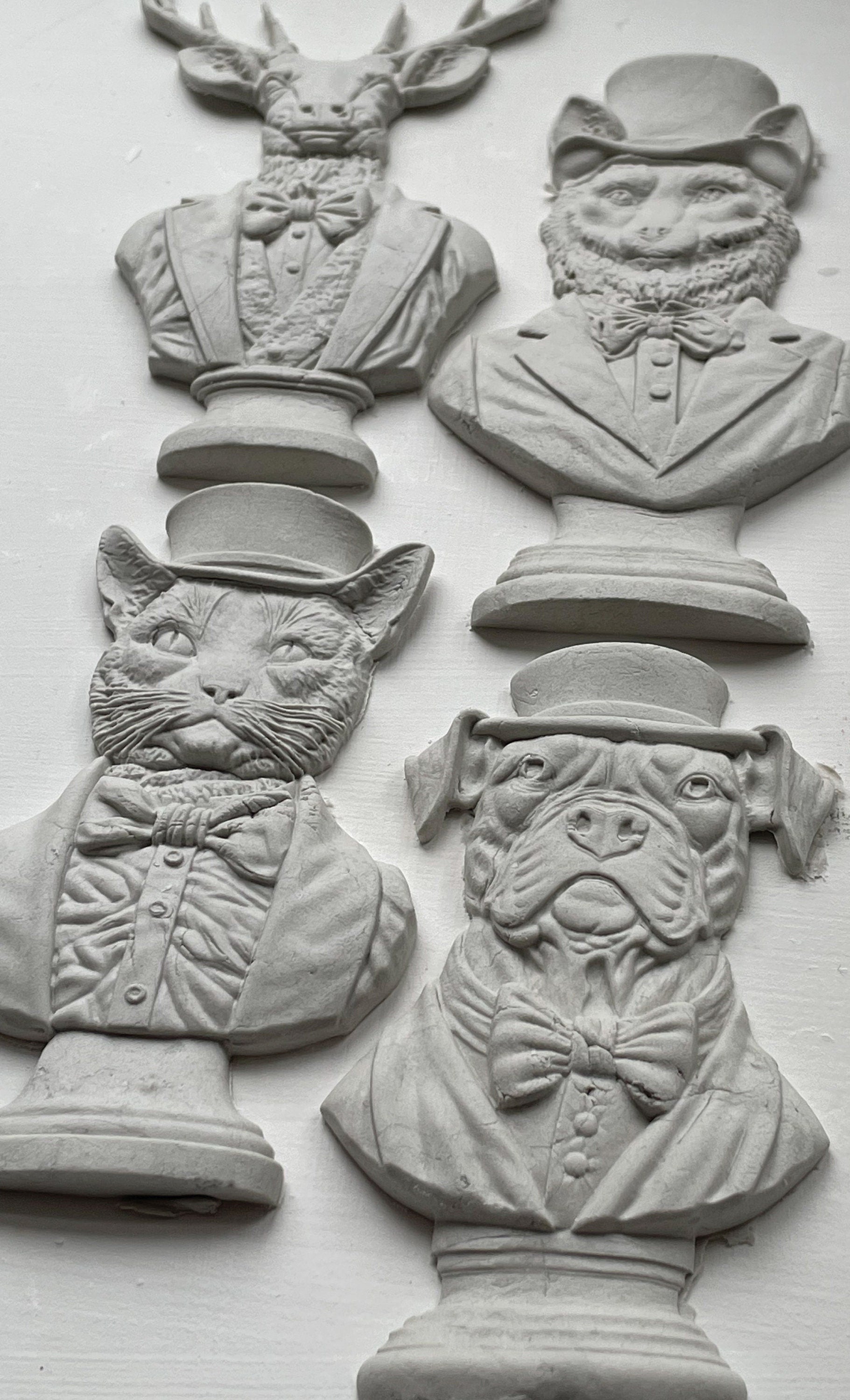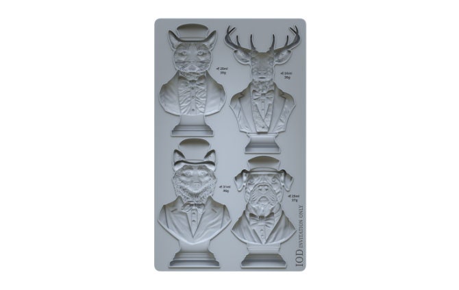 This 6x10 mould has a bulldog, fox, deer & cat design - all dressed to impress! The overall moulds are thoughtfully designed for ease of use and maximizing your decor applications. Casting moulds can bring a new dimension to your craft projects, use your choice of medium such as air dry clay, paper clay, hot glue, soap or use resin pours to make beautiful casts. Perfect for adding embellishments on furniture, signs, tiles, pots and so many other creative ways to use them! These moulds are also food safe and can be used for creating chocolate molds, pie embellishments & cake elements! If using for food, you must not use for clay or other medium - buy 1 for food use and 1 for crafting!