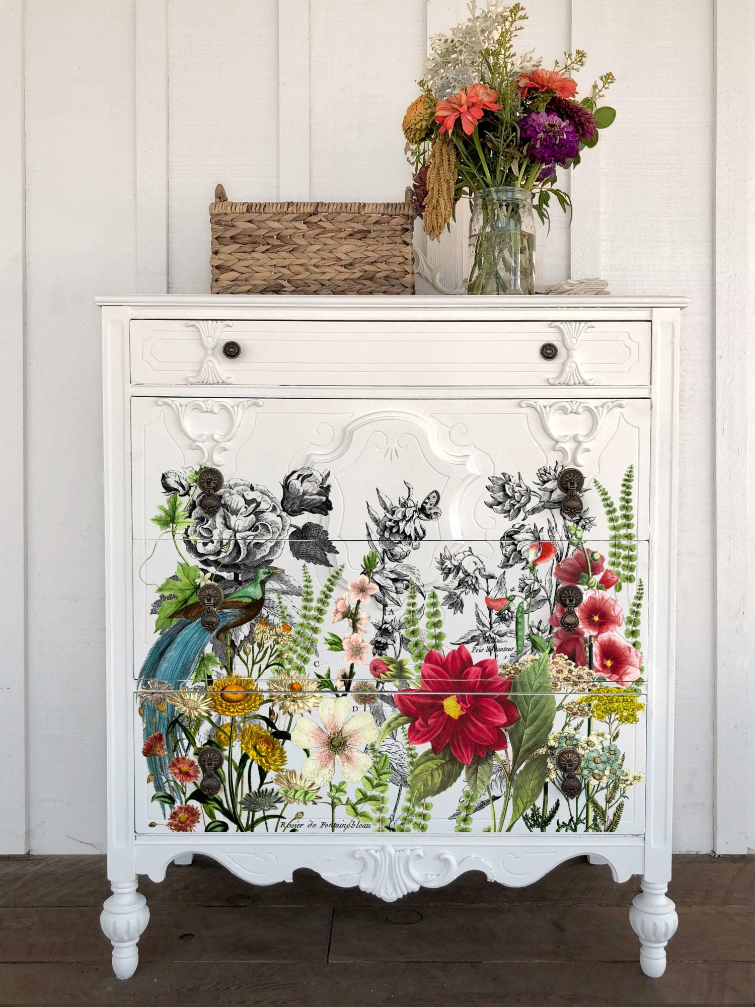 This 12x16 pad has multiple sheets that come together as a large blooming floral with peacock design - use the entire design as is for a large feature wall or piece of furniture or cut out the sections you want to use for smaller projects! The collection of transfers are thoughtfully designed for ease of use and maximizing your decor uses to build your own scenes with individual transfers by grouping them together. Transfers aren’t just for wood projects! Use transfers to enhance windows, mirrors, & more! Perfect for adding little embellishments on pots, plates, cups, cards or full scenes to furniture projects.