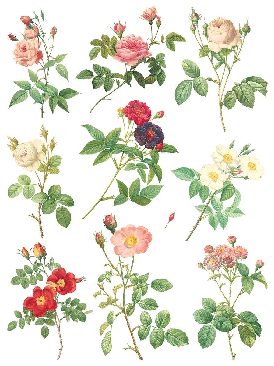 The Rose Botanical transfer set captures the intricate beauty of antique botanical illustrations. Each full-color sheet features a variety of rose species, rendered with exquisite detail and vibrant colors in the unmistakable style of Redouté.