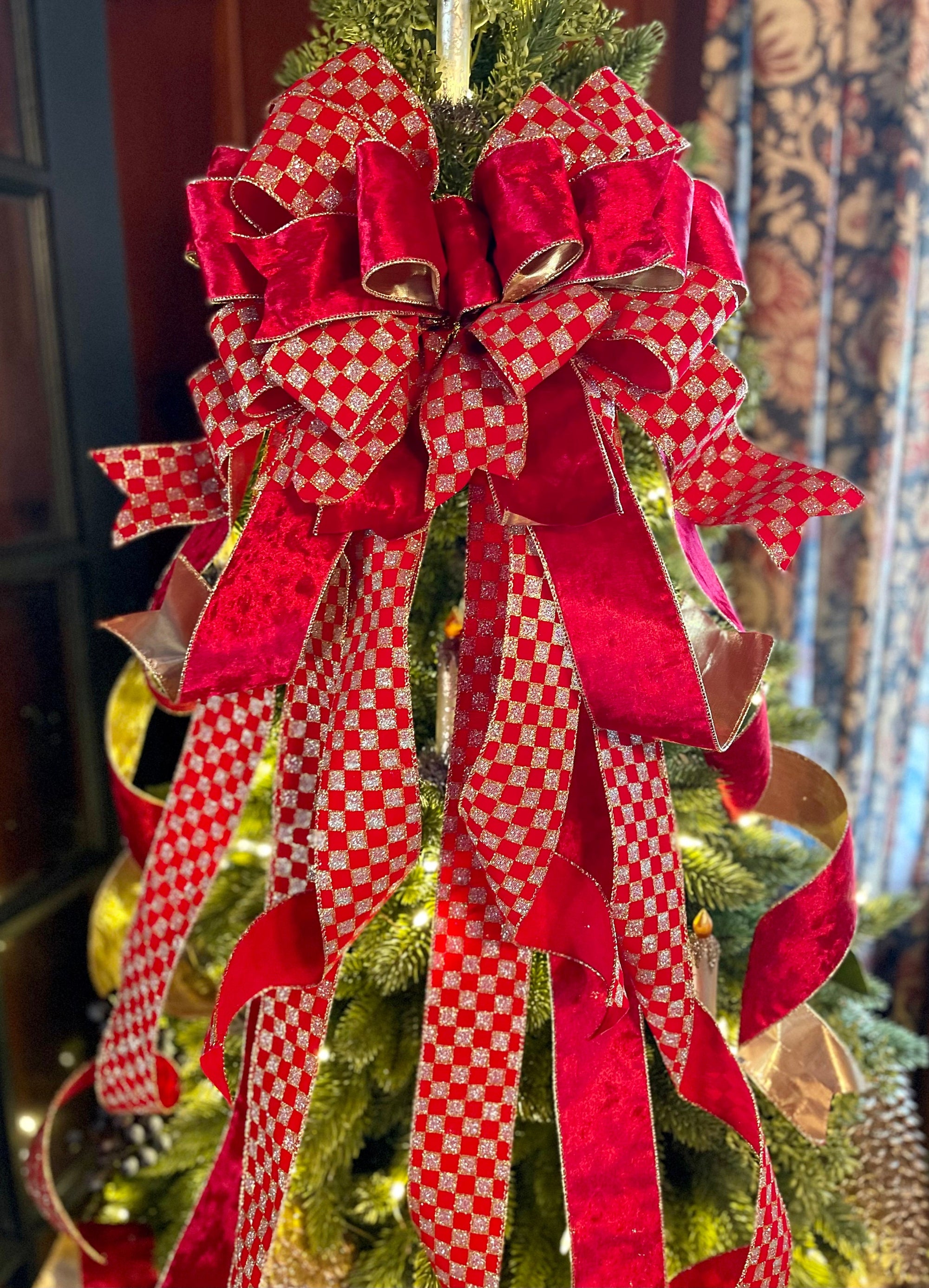 What a spectacle to behold! Some may even think that Charlotte’s luxurious silky gold trimmed velvet was cut directly from Santa’s suit! Crafted using all premium fabrics - a plush double sided velvet of red & gold and a red velvet check with silver and gold glitter for extra sparkle. Not your average ribbon found at big box stores - the fabrics not only look lux, but one touch and you’ll know the difference!
