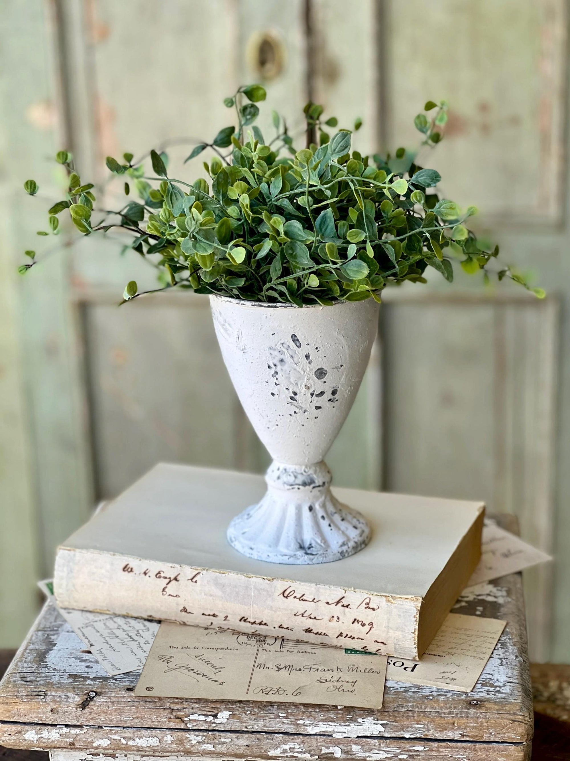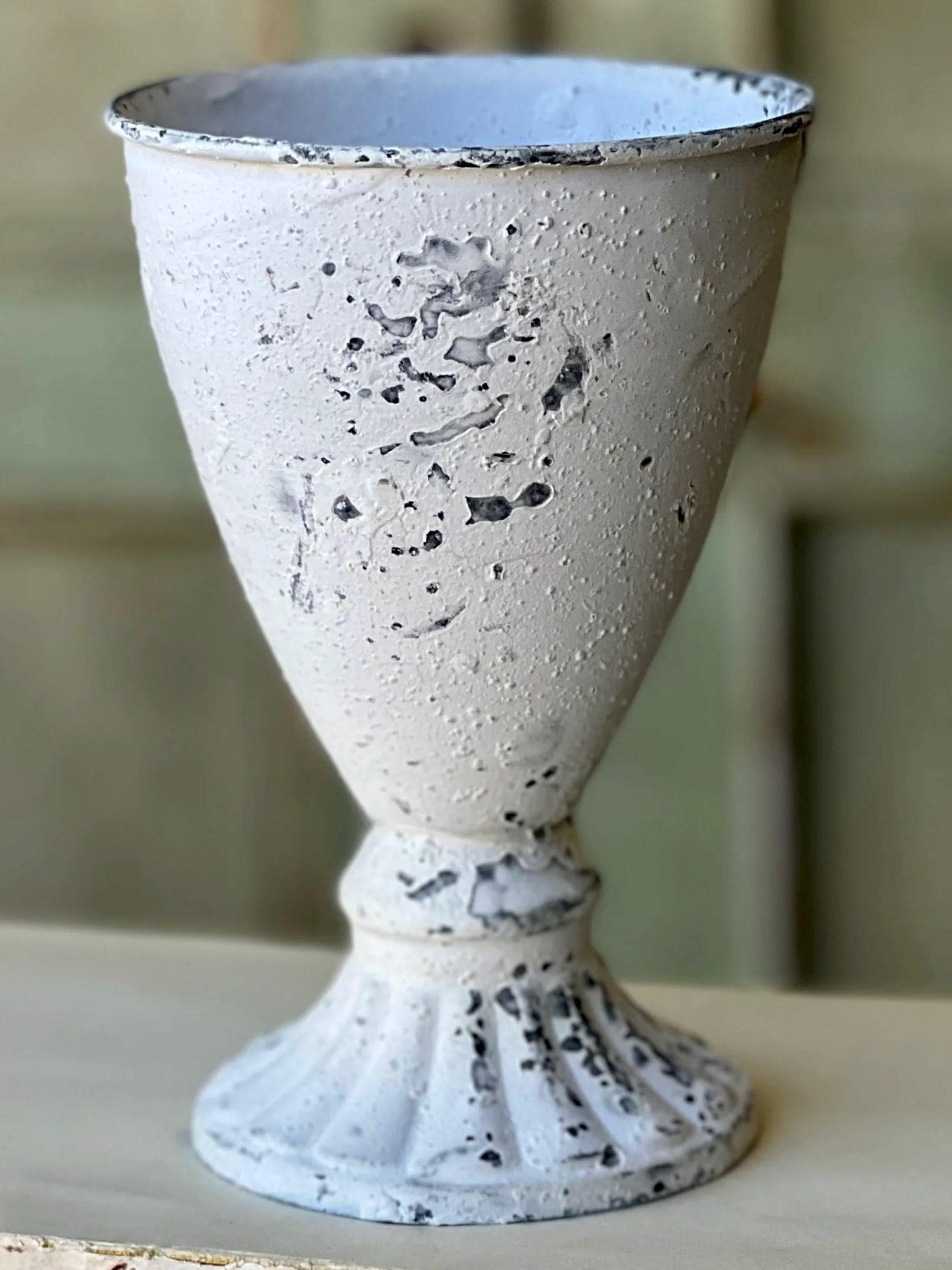 Lovely small stand that looks lovely with fresh flowers, potted plants, topiary or as an orb holder. Textured creamy white paint on silver metal & slightly distressed, this piece perfectly accents shabby chic, farmhouse, rustic or cottage decor. Lovely on mantles, countertops, islands and accent tables.