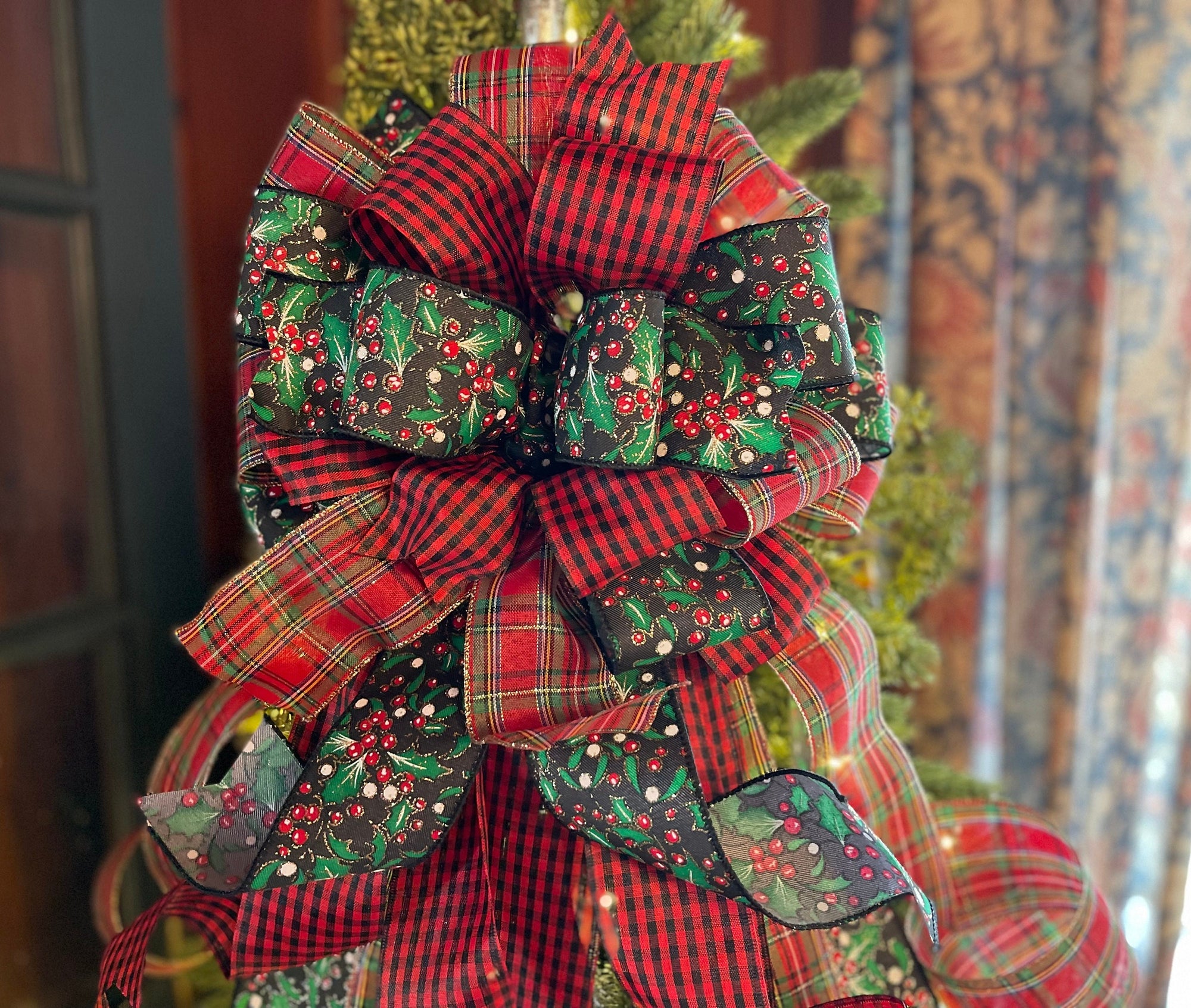 Simple but elegant with just a bit of sparkle to enhance the holidays! Made with three fabrics in complimentary colors - A red & black gingham check, a classic red green and gold plaid and a lovely black with holly leaf and red glitter berries.