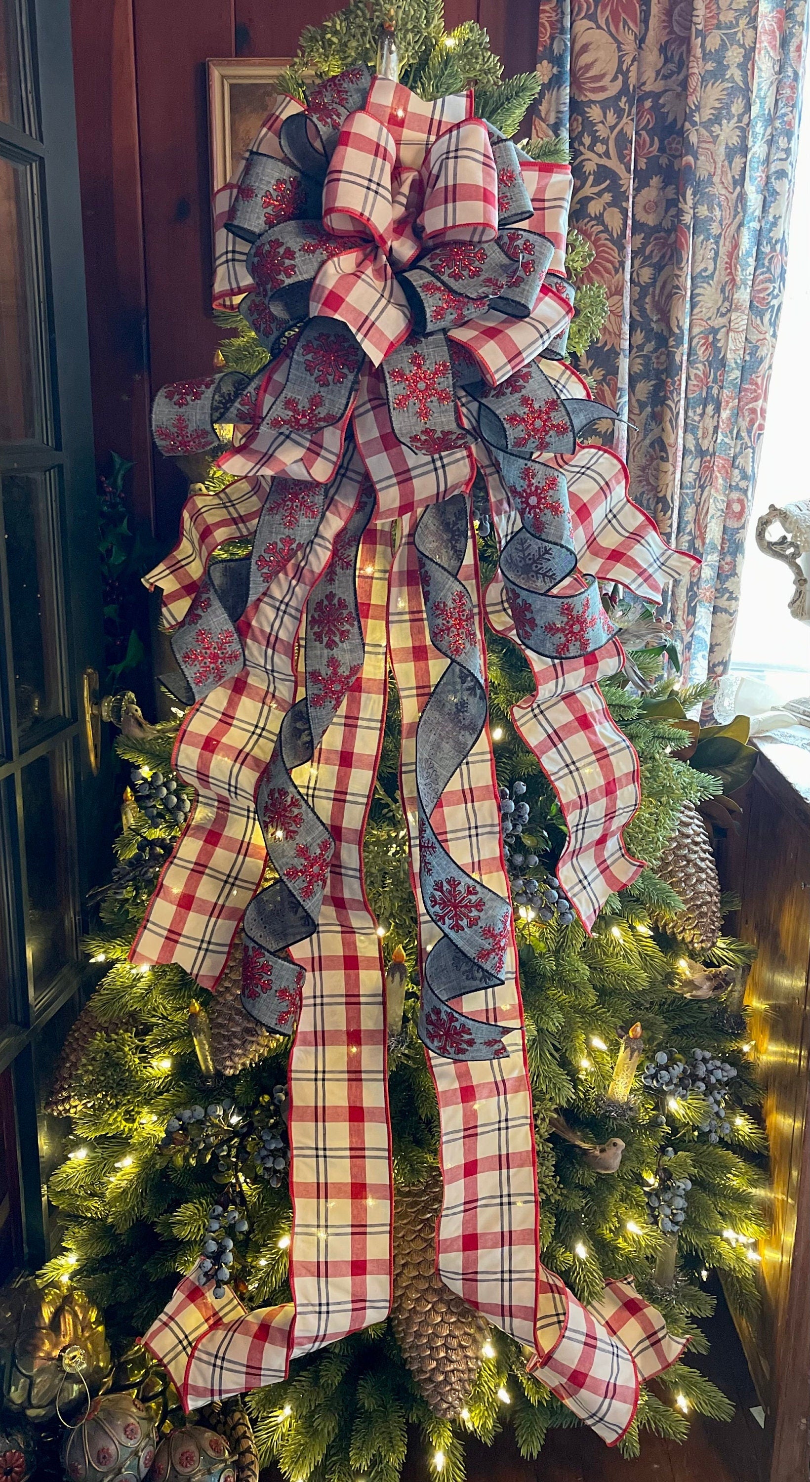 Lydia is trendy, timeless & looks great with every style for the entire winter season! Perfectly at home with farmhouse, traditional, modern or elegant decor! This beauty is big, full & expertly crafted with a premium red glitter snowflake on navy hopsack fabric & a premium soft cotton red cream and charcoal grey plaid fabric in an extra wide 4” cut. Bow has varying streamer lengths for a lovely cascading effect around your tree.