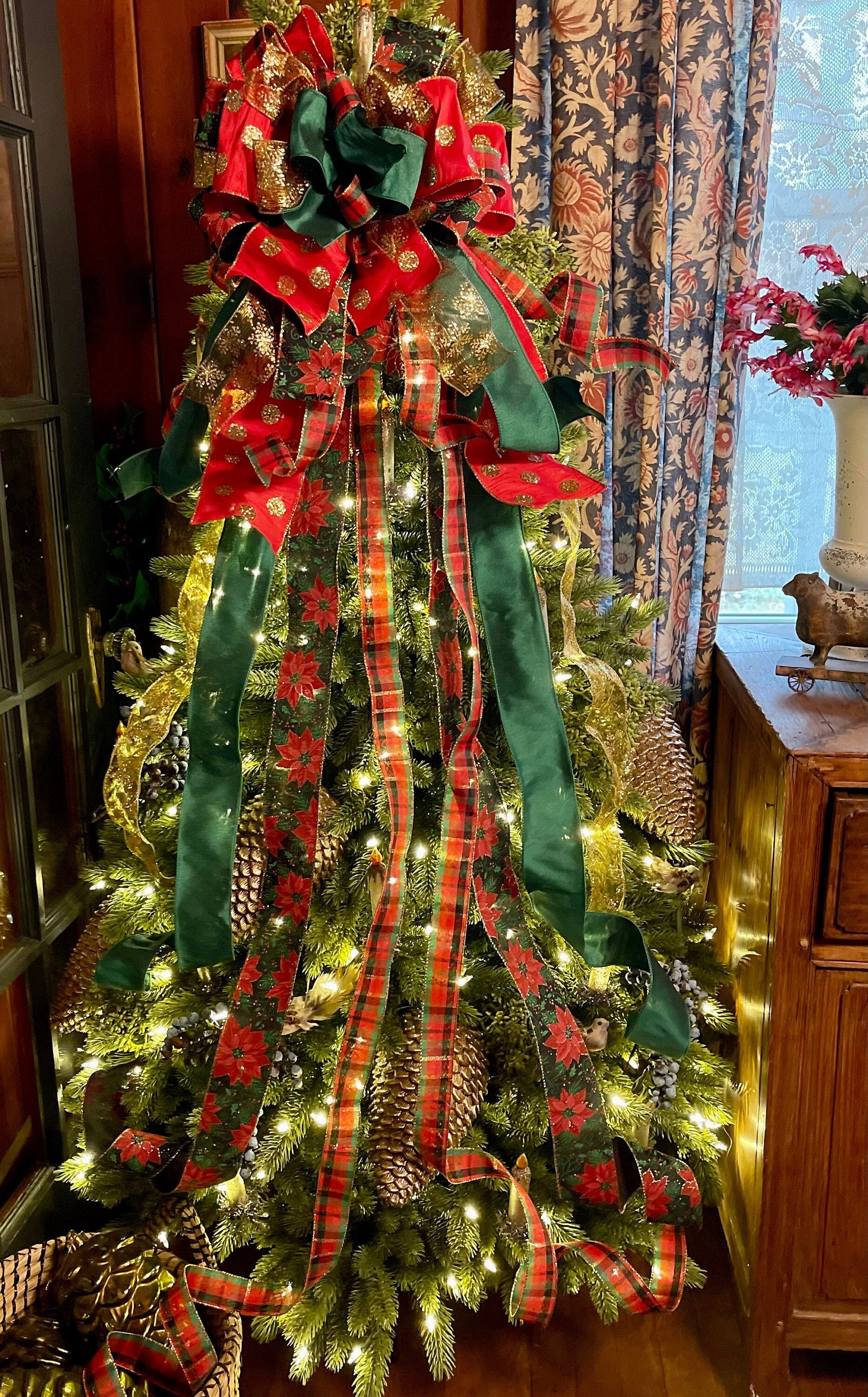 Mae has a little of everything and has just the right amount of loops, long streamers, and plenty of twinkling color! Curl, tuck or swirl the 6ft long streamers around your tree and marvel at the shimmer. Made with 5 fabrics - a holiday red green and gold poinsettia on black fabric, a second multi color plaid print, a 4” wide cut bright red with gold glitter polka dots, a solid green and a gold glitter snowflake design - all perfect for the holiday season!