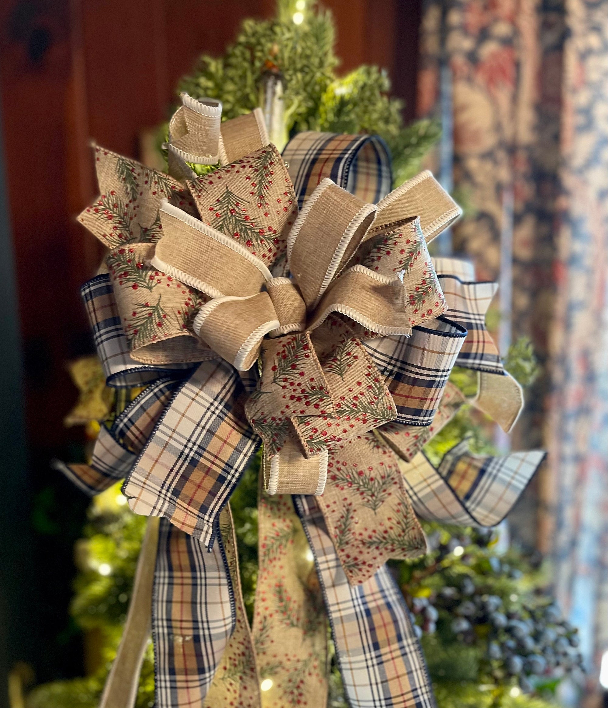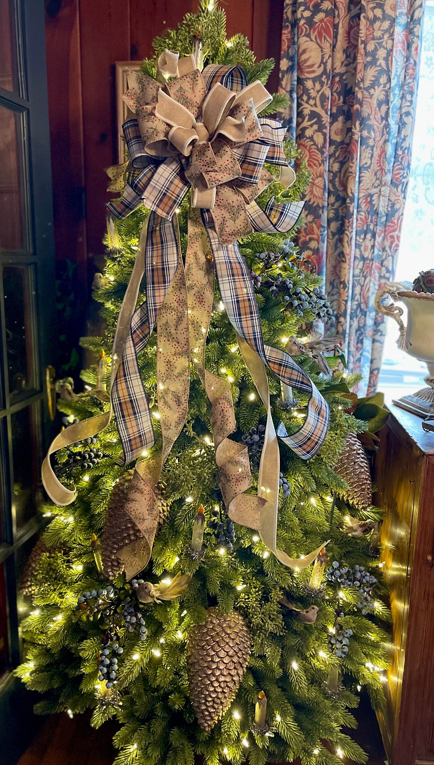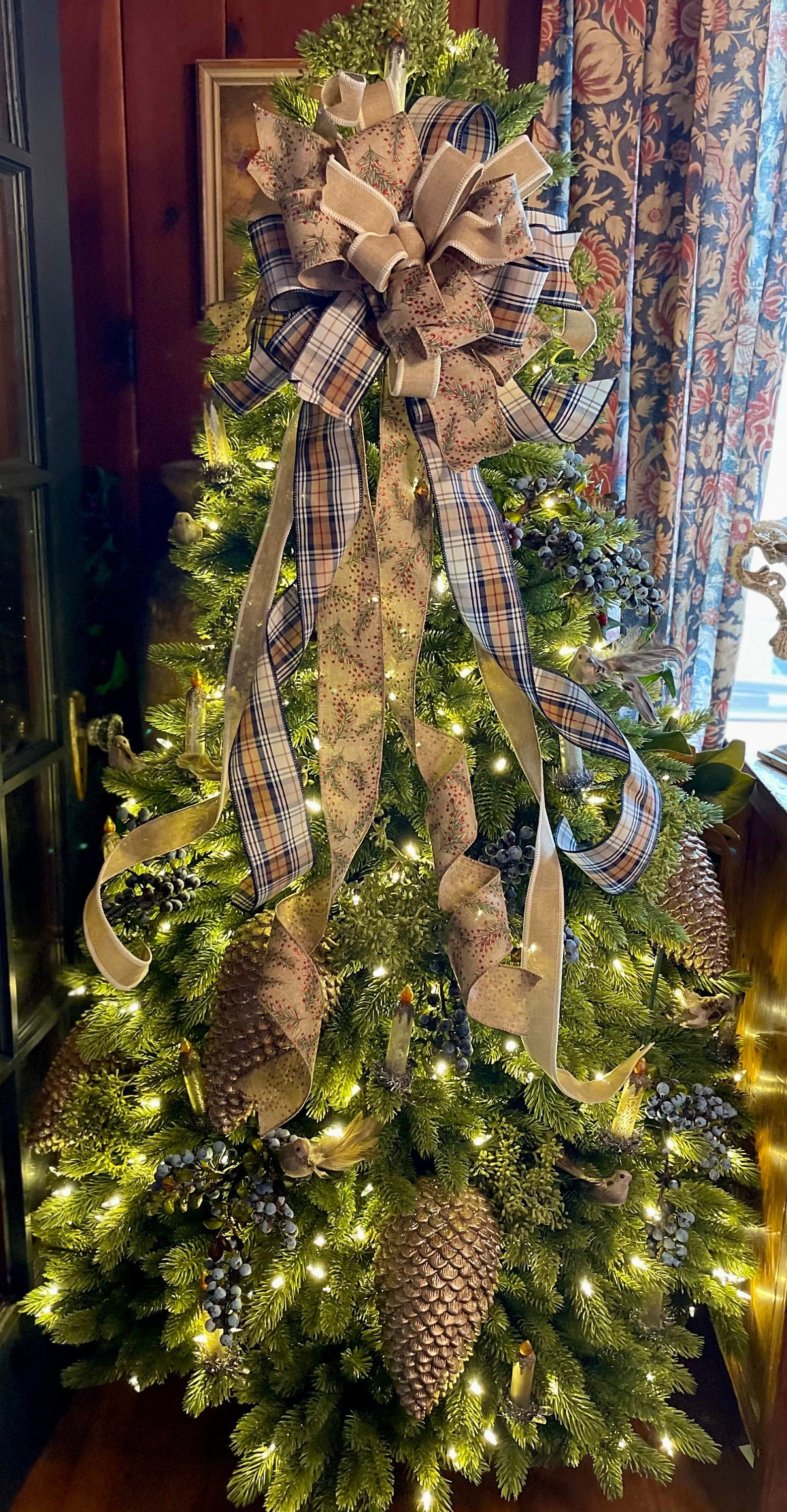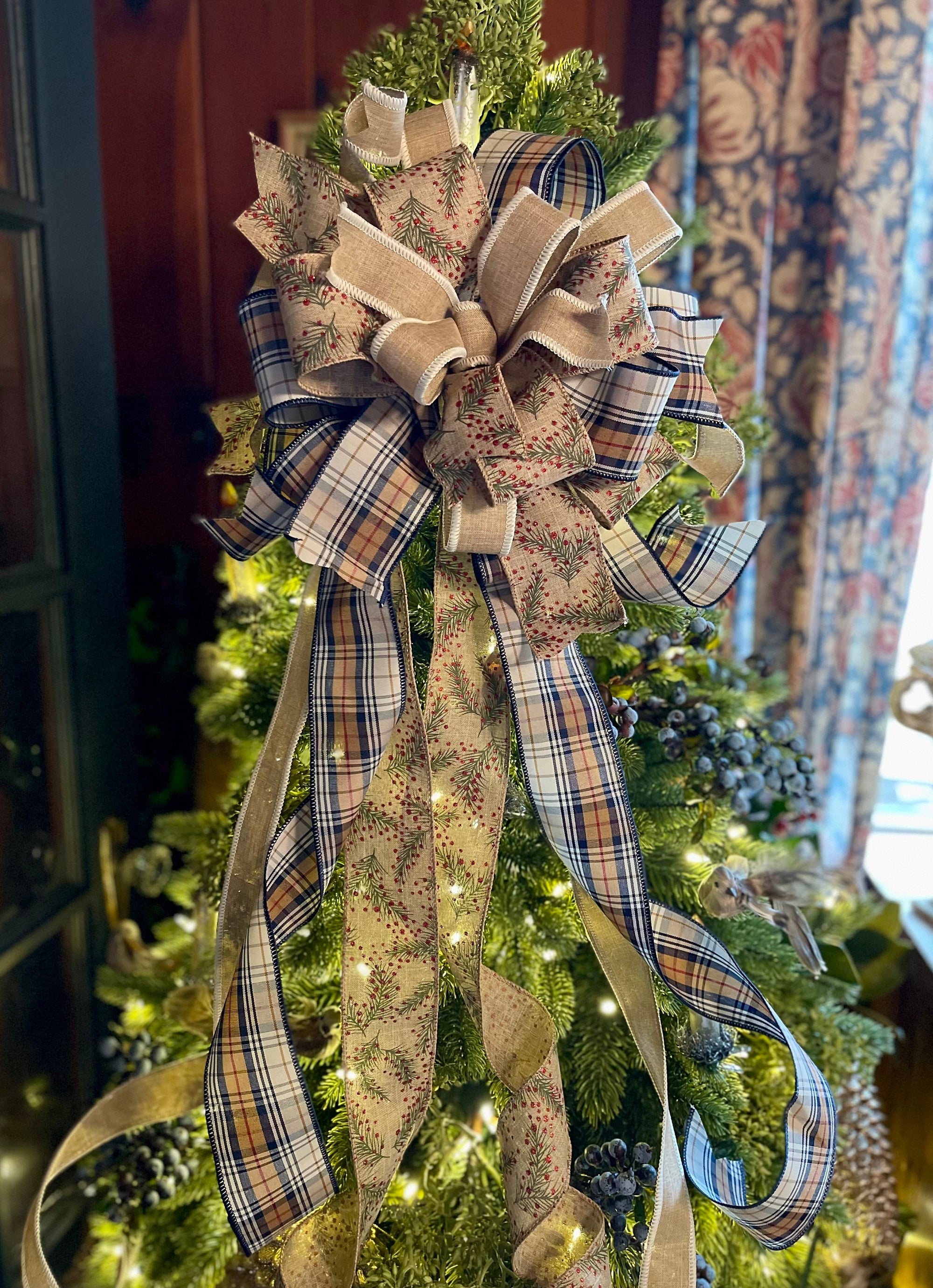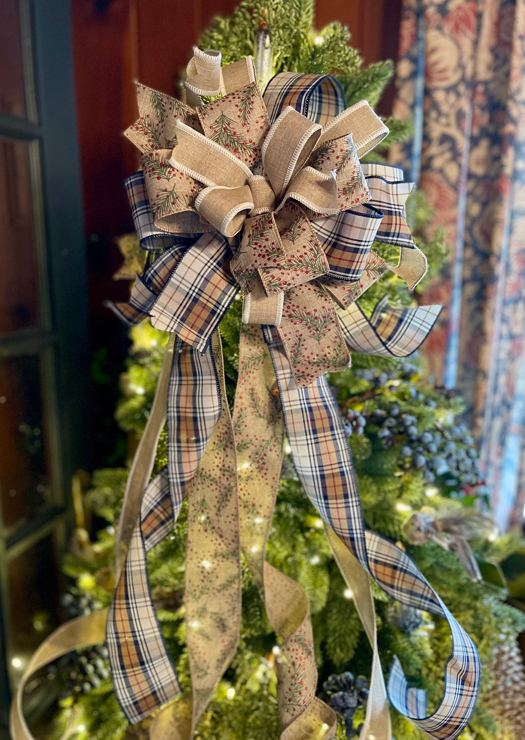 The Nora Christmas tree topper bow is perfect for modern farmhouse decor! This beauty is made with three gorgeous fabrics - a premium navy blue plaid, a tan & cream, and a glittering holly vine with berries. Bow has varying streamer lengths for a lovely cascading effect around your tree.