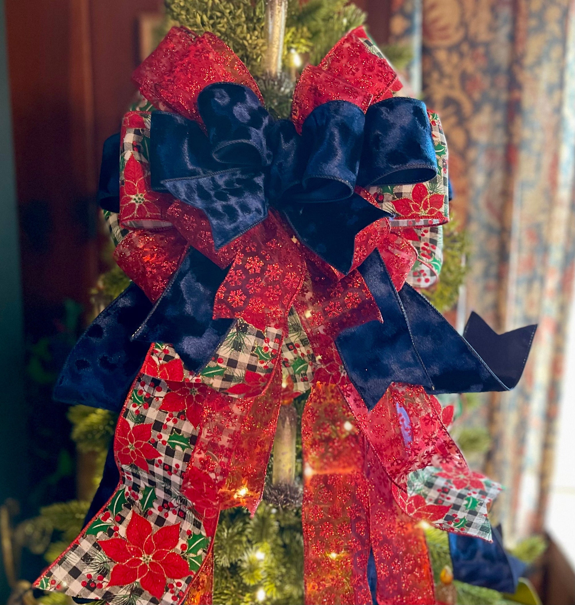 Jenna sets the bar for modern farmhouse flair! Velvety soft, a little flashy but still true to her country gingham roots! She’s a big wide bow coming in at 15” and has 2 premium fabrics! This stunning lady is made with three gorgeous fabrics - a rich brushed navy blue velvet, sheer glittering snowflakes, and a navy blue gingham with red glitter poinsettia fabric. Bow has varying streamer lengths for a lovely cascading effect around your tree.