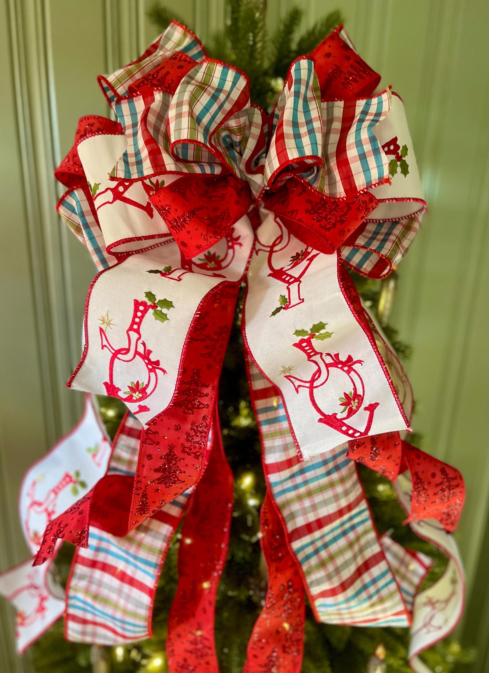 All the charm & sparkle your tree needs! Joy is a joy to behold with three luxury fabrics, two of which are an extra wide 4” width - a red blue and white plaid, a glittering deep red tree print & a white with colorful embroidered Joy script. Lots of streamers provides excellent coverage for your tree