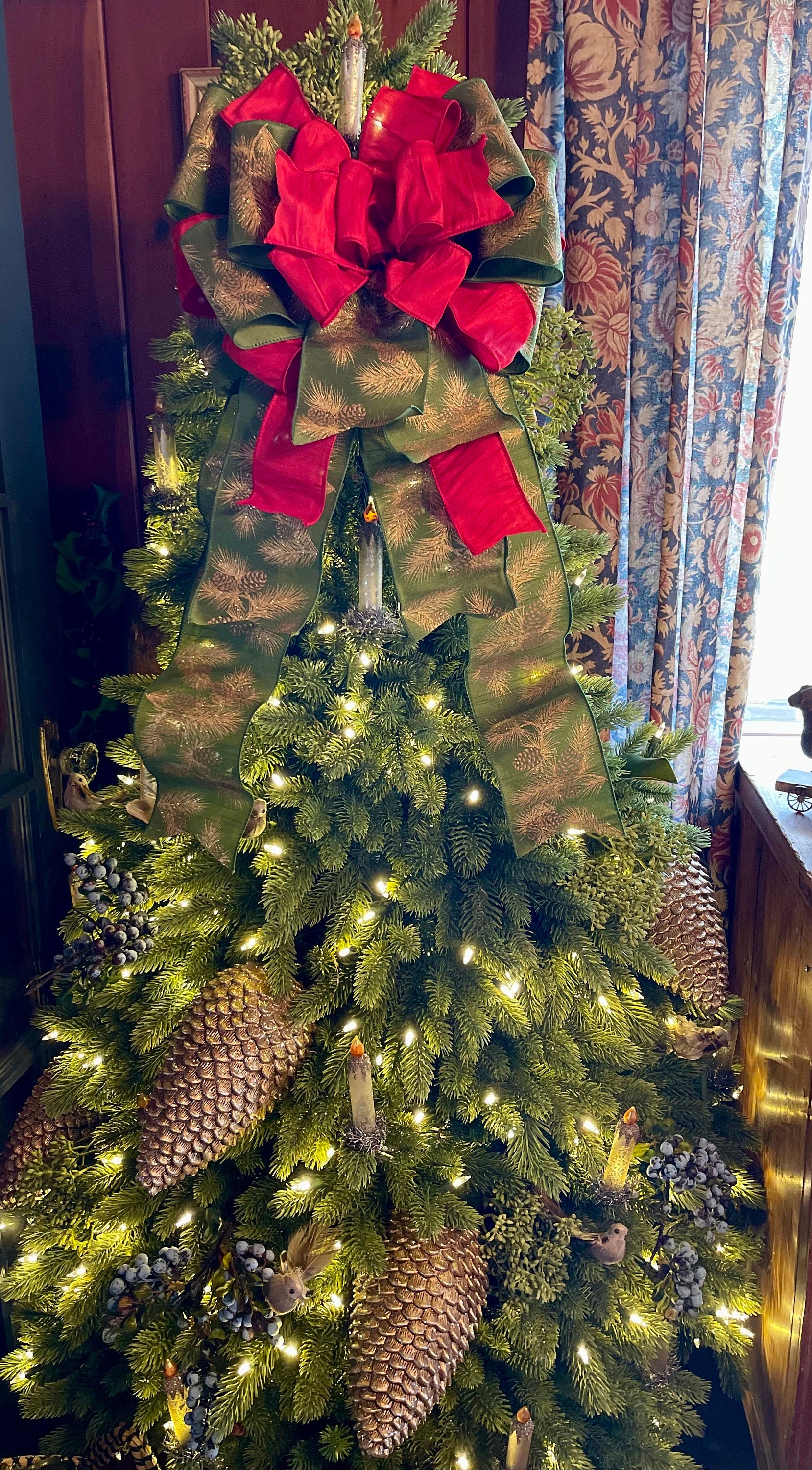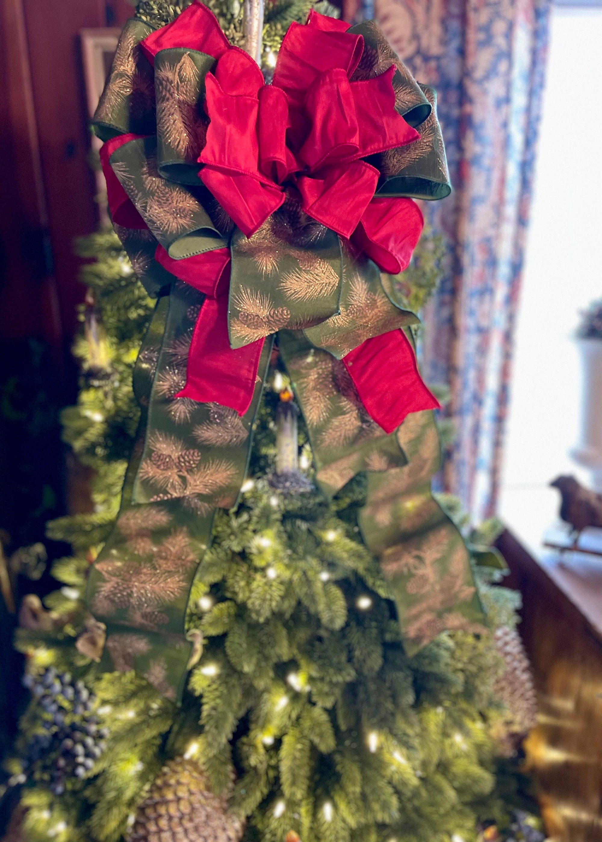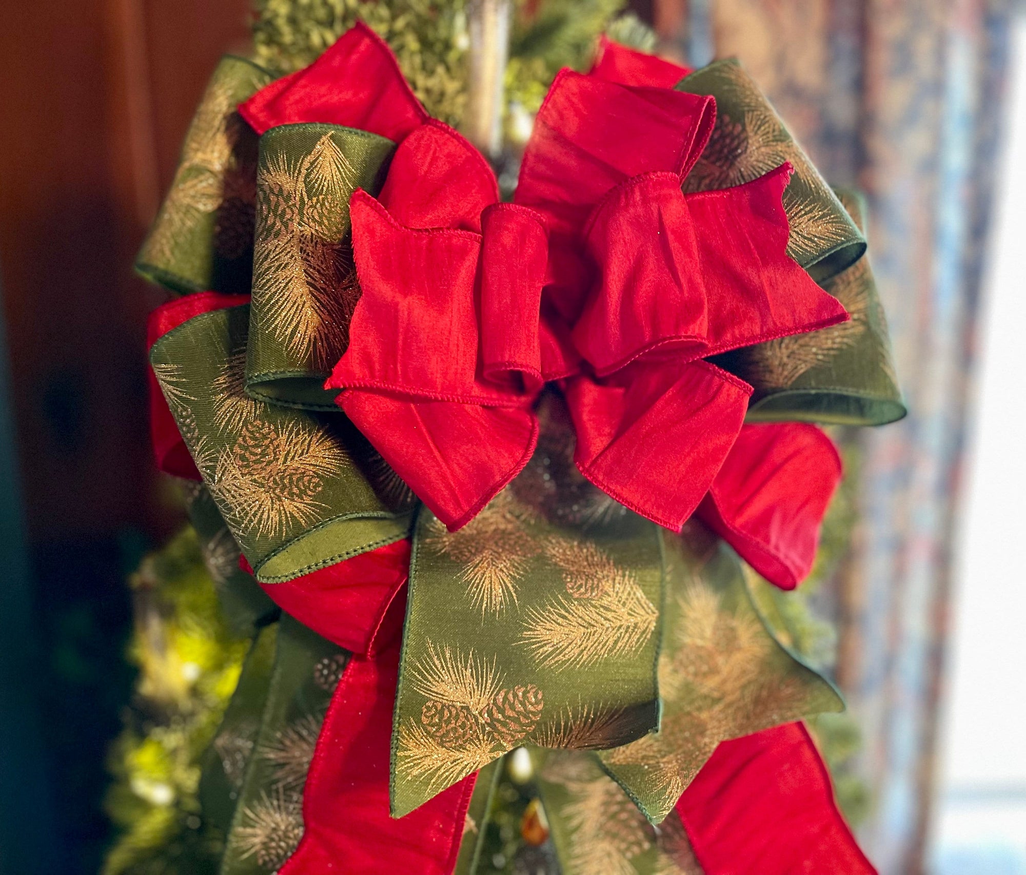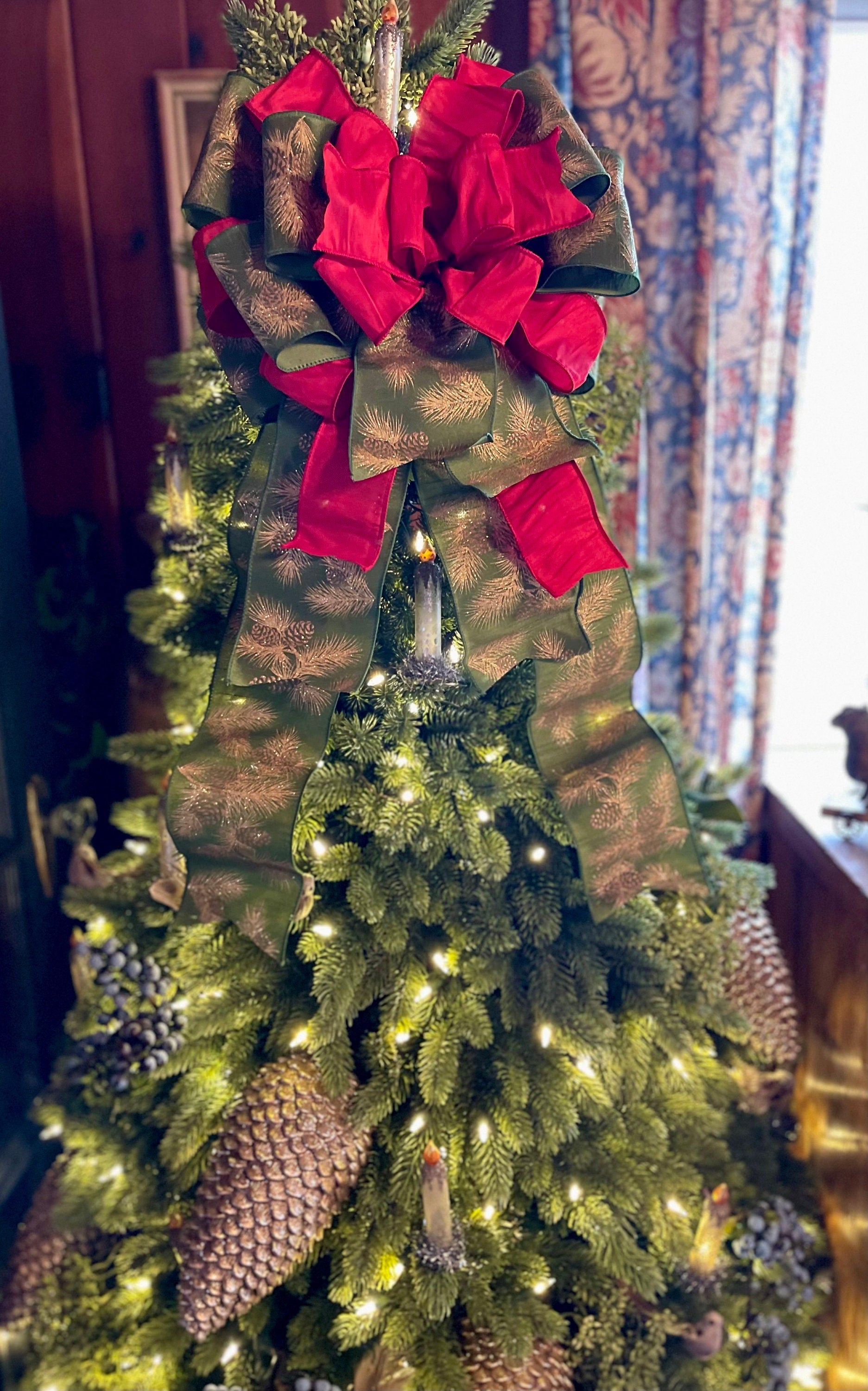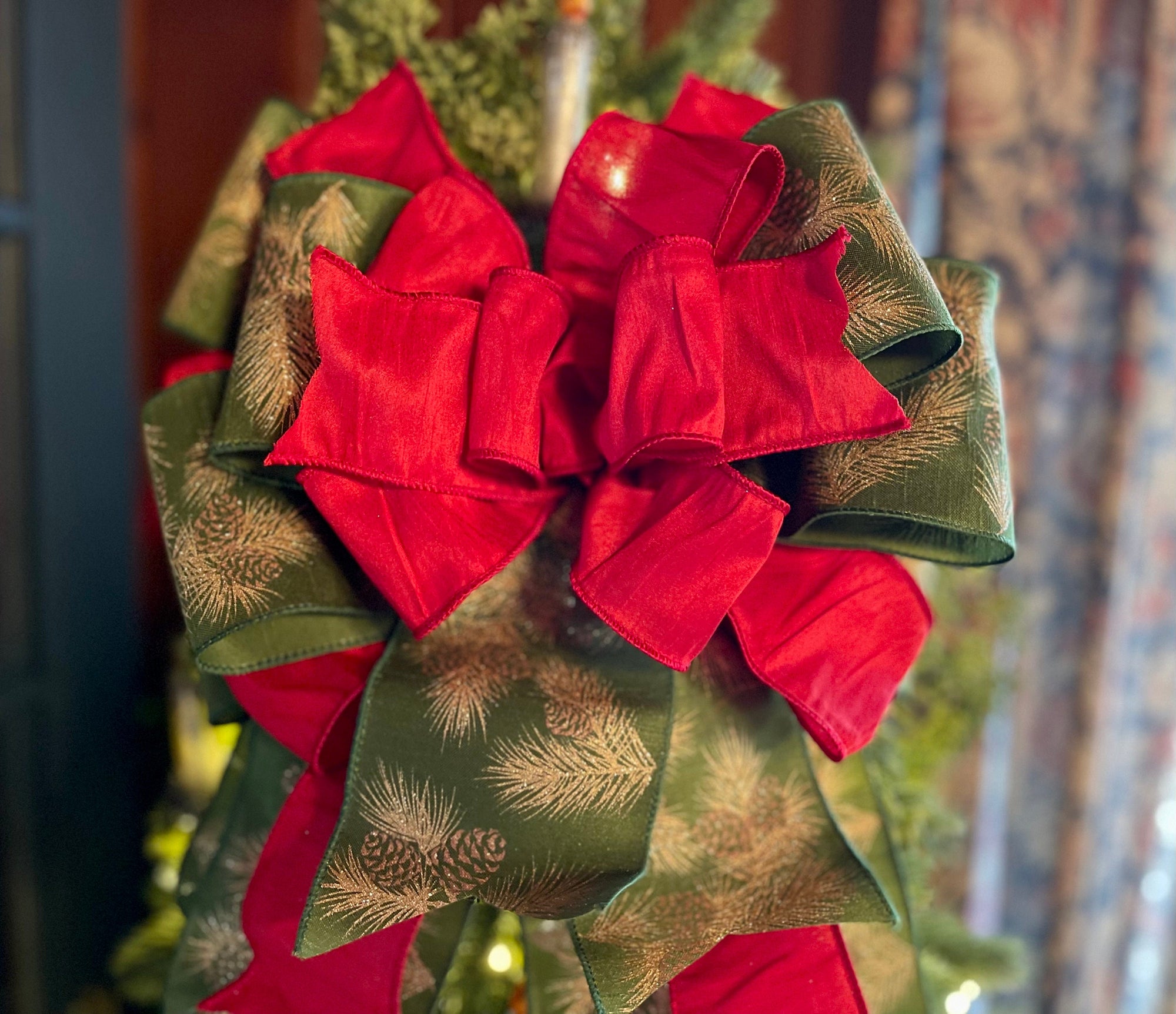 Naomi is high style with her rich reds and sumptuous duponi silk fabrics. Made with two luxury fabrics - an extra wide 4”cut green with gold glitter pine boughs and a premium red duponi silk fabric. Wide loop bow, just right to crown your tree without super long streamers to interfere with ornaments.