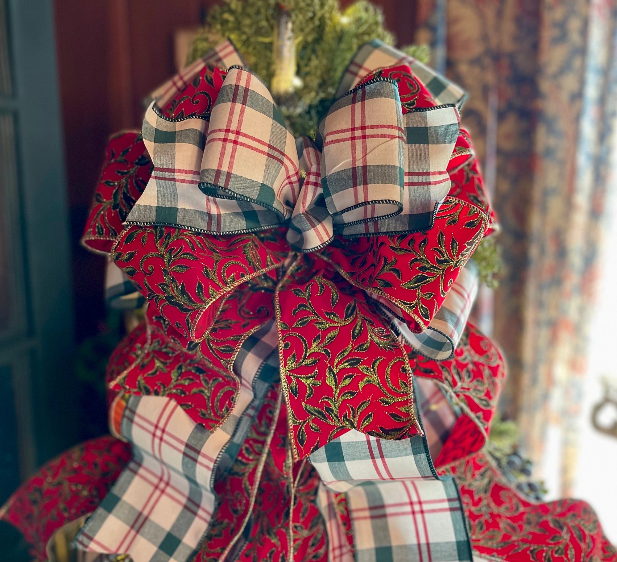 Classic soft beauty with a touch of glittering elegance - Ophelia is perfect for the entire holiday season. This beauty is big, full & expertly crafted with a premium red with green leaf detail edged in gold glitter fabric & a premium soft cotton green cream and red plaid fabric in an extra wide 4” cut. Bow has varying streamer lengths for a lovely cascading effect around your tree.