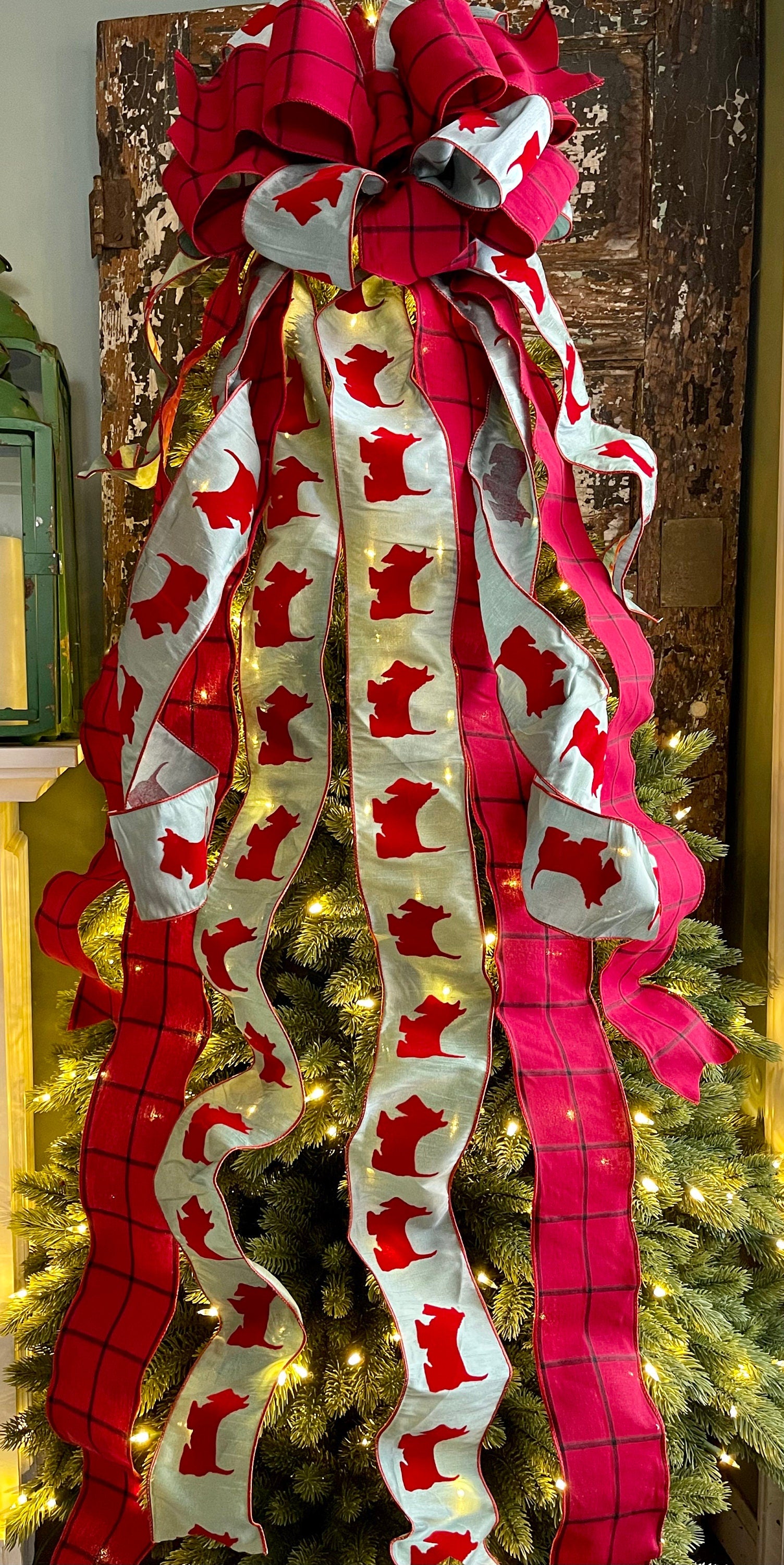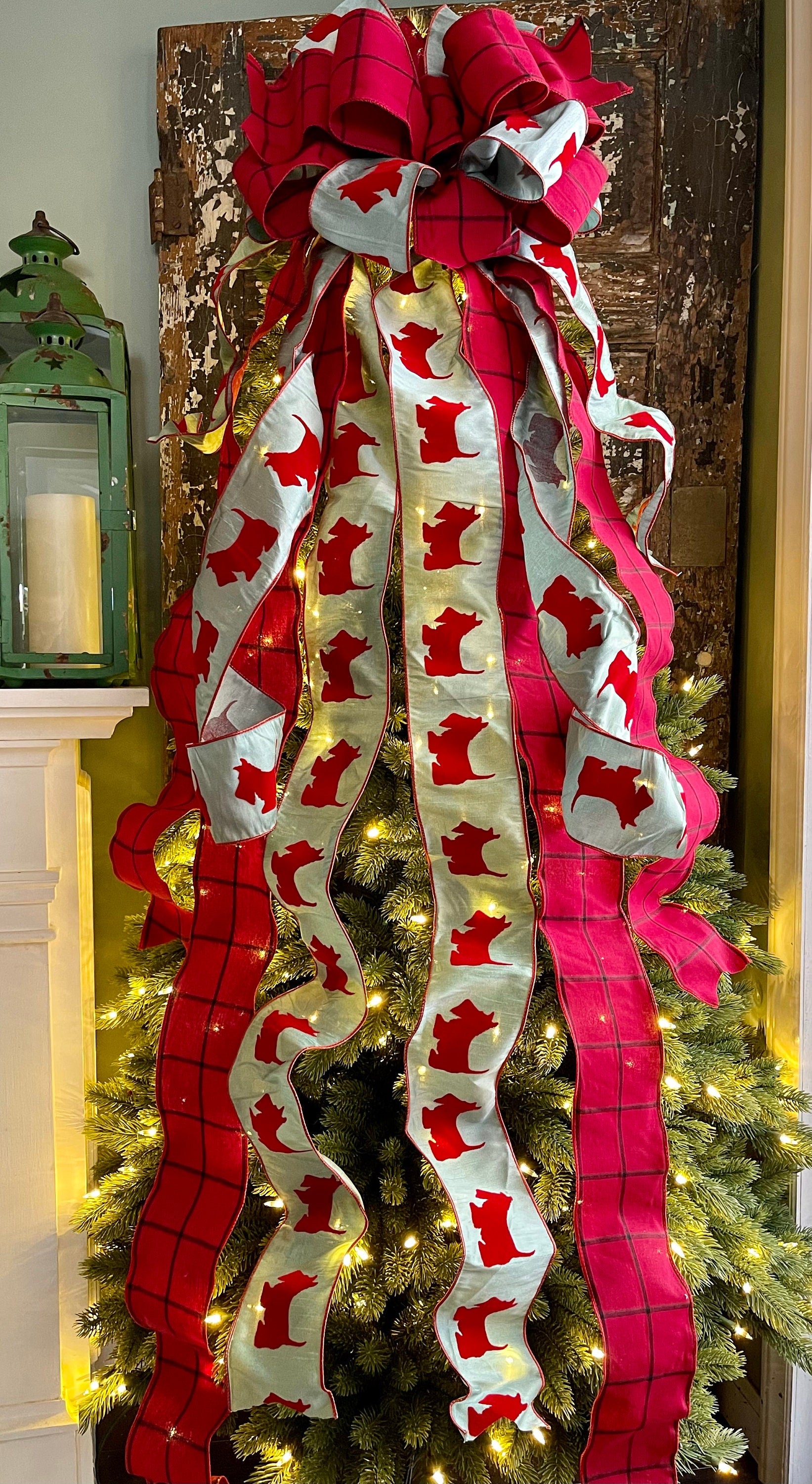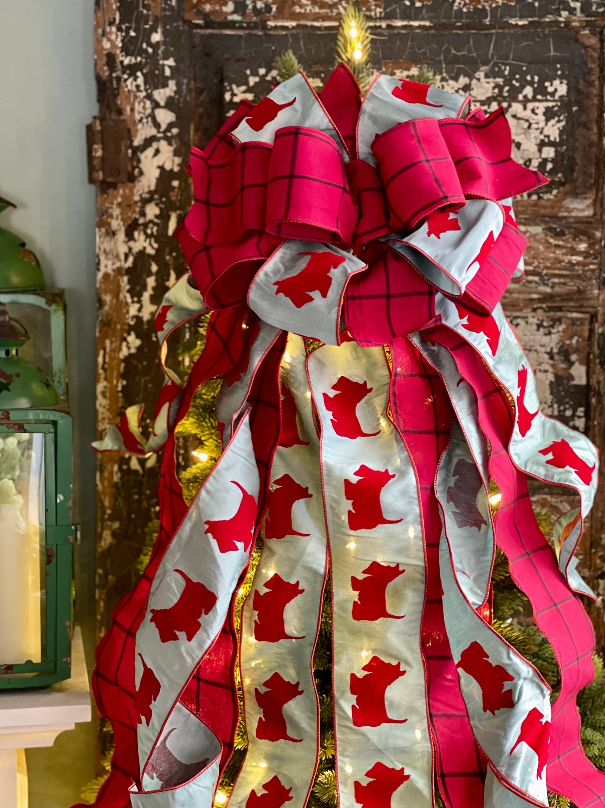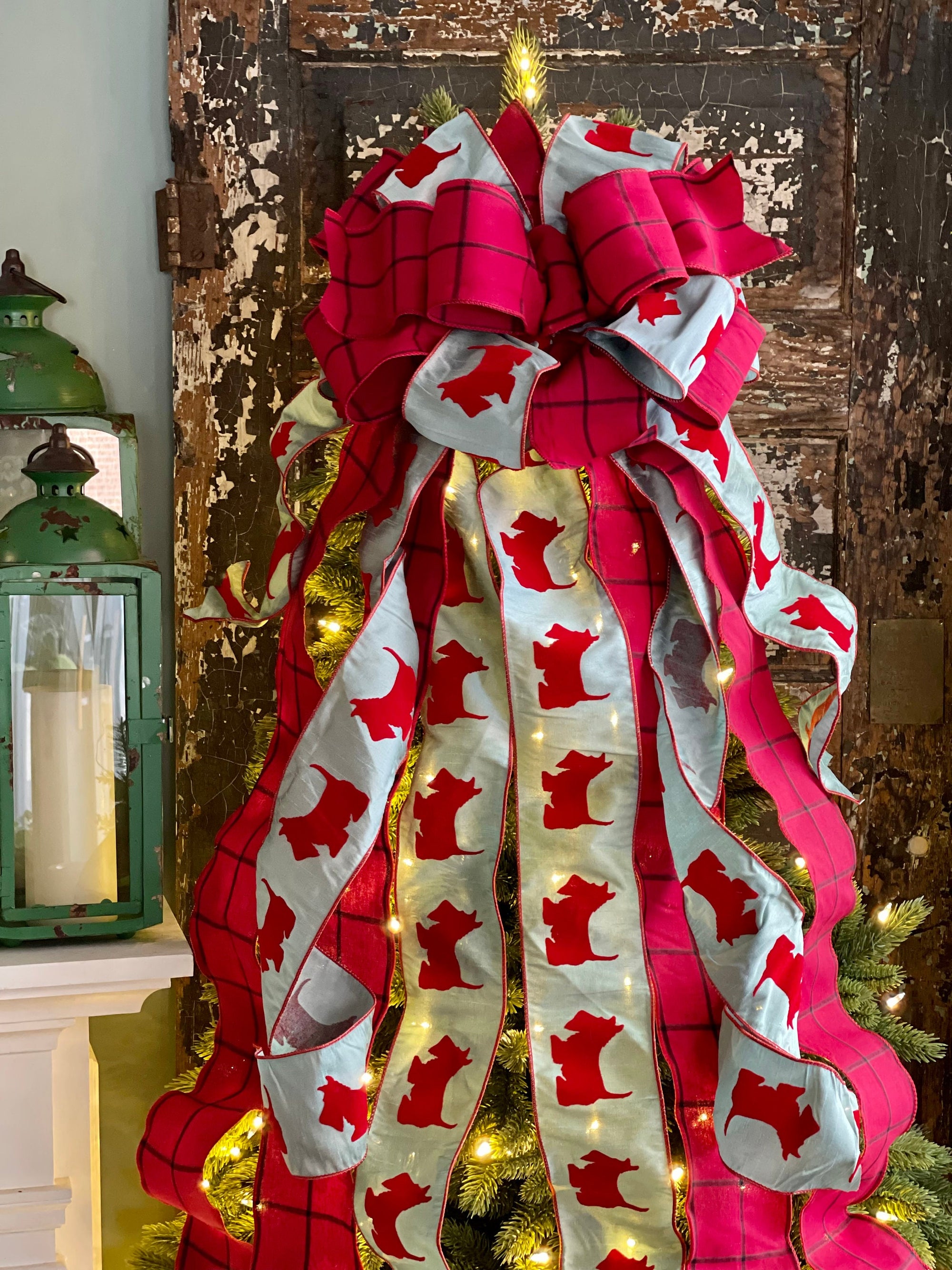 The Scottie Christmas tree topper bow is perfect for Scottie lovers! This beauty expertly crafted with premium sky blue fabric embellished with soft fuzzy red Scottish terriers & a premium red with dark navy (almost black) plaid print in an extra wide 4” cut. Bow has varying streamer lengths for a lovely cascading effect around your tree (4 short, 4 mid length with 4 long).