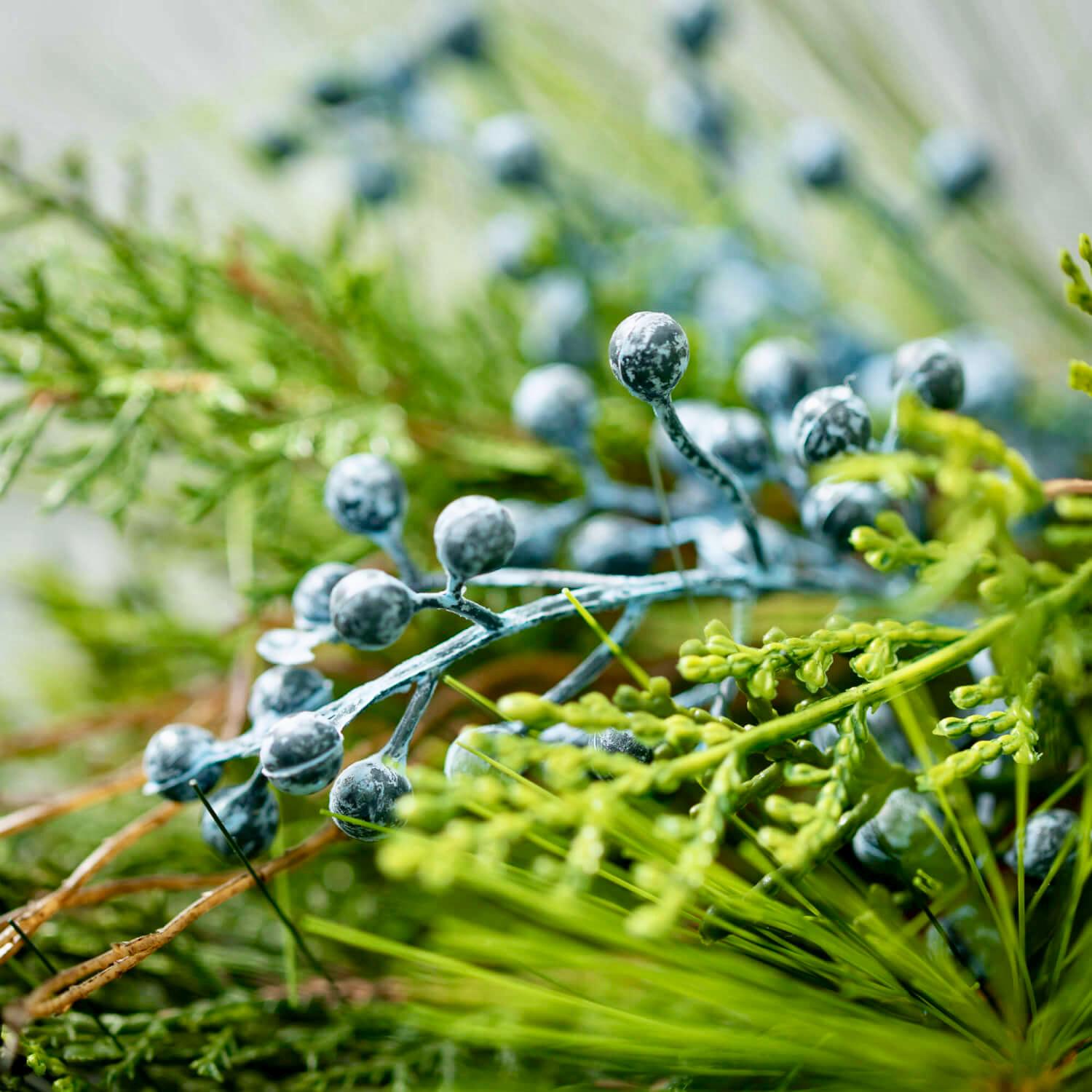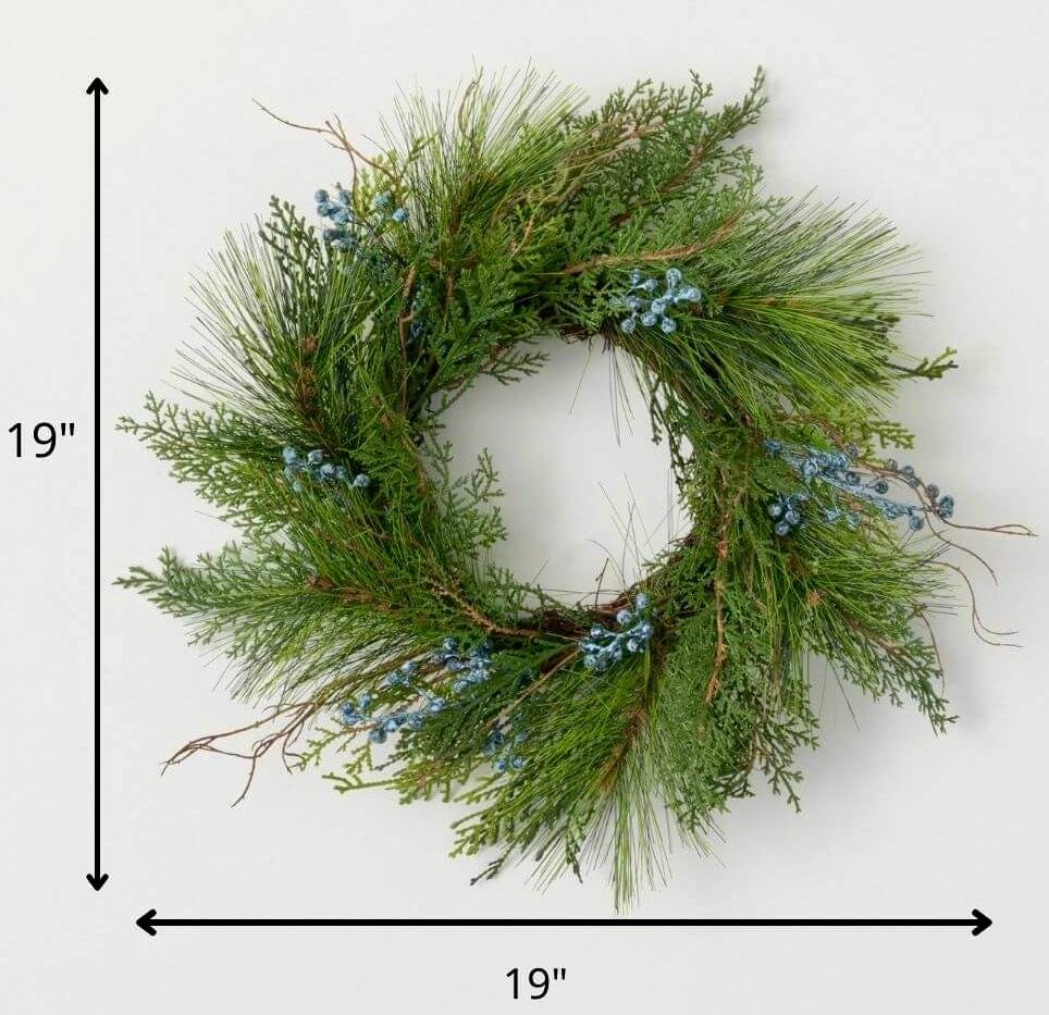 Decorate your home this season with this gorgeous 6.5" juniper wreath. With brilliant green pine and clusters of blueberries, this mini wreath will be the perfect final touch to any holiday decor. Can be used as a mini wreath for accenting signs or slipped onto the base of a candle holder for an elevated centerpiece on tables. Pairs perfectly with any of our wood or metal pillar candle stands for a finished look.