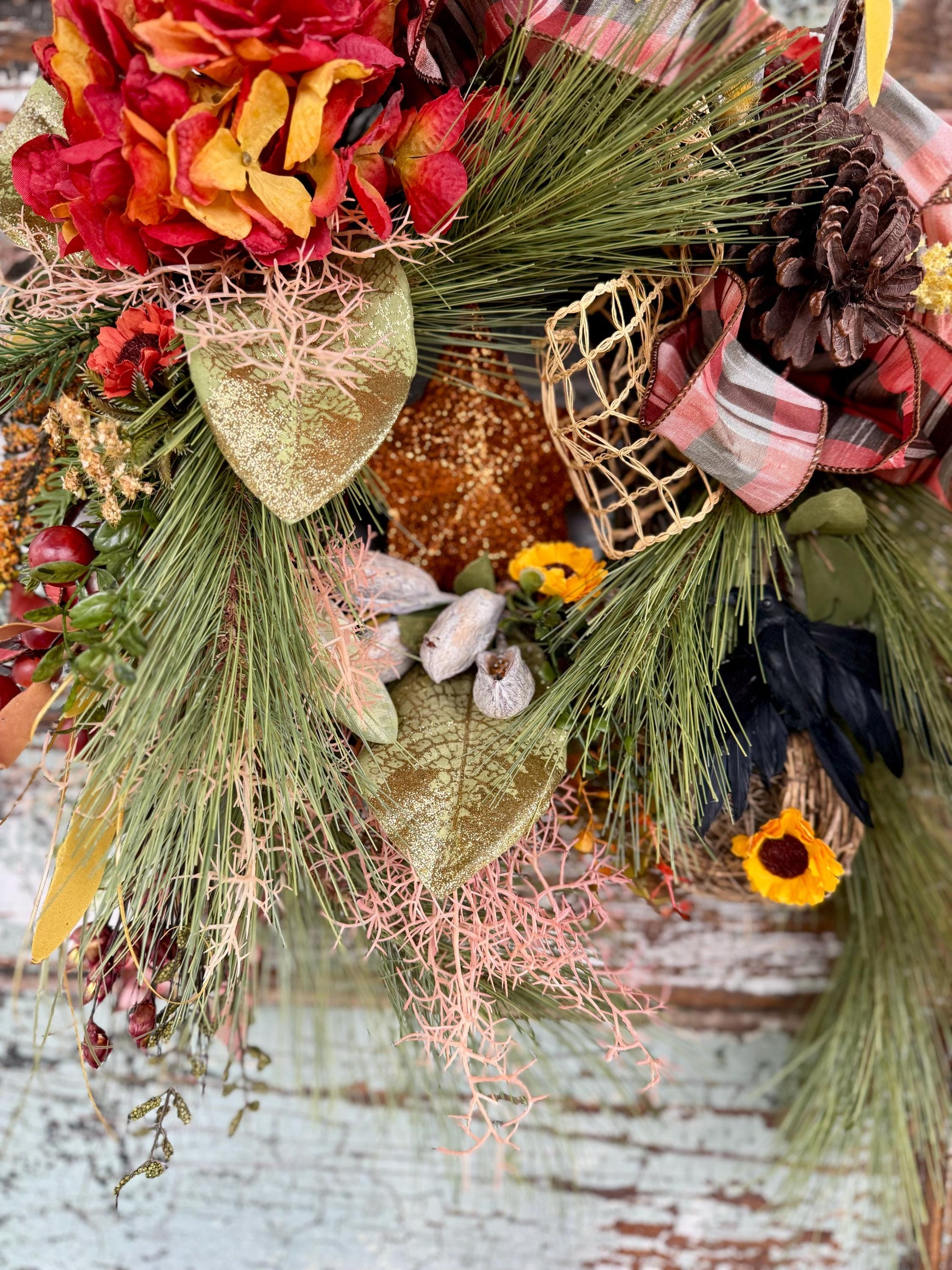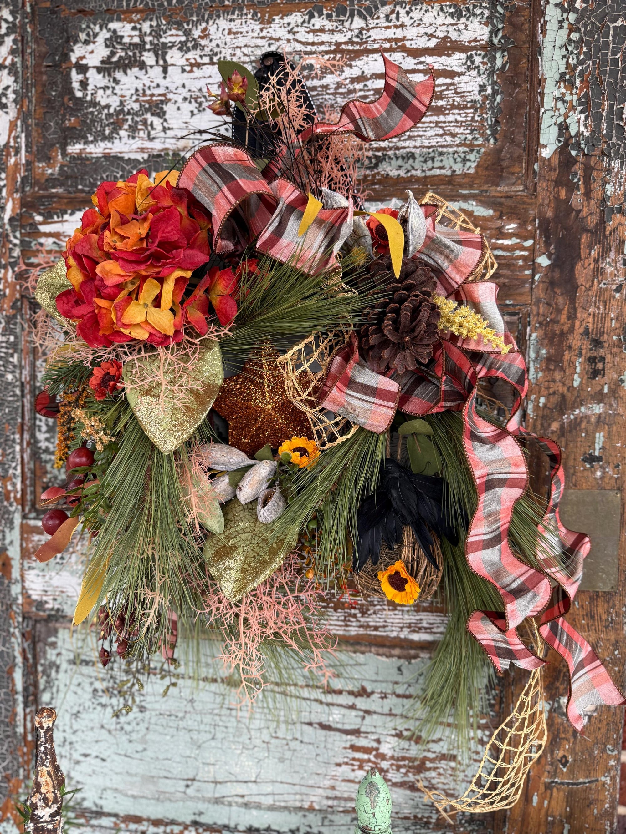 Materials: ribbon, glue, silk flowers, fall leaves, hydrangeas, berries, acorns, Raven, birdnest, pine.